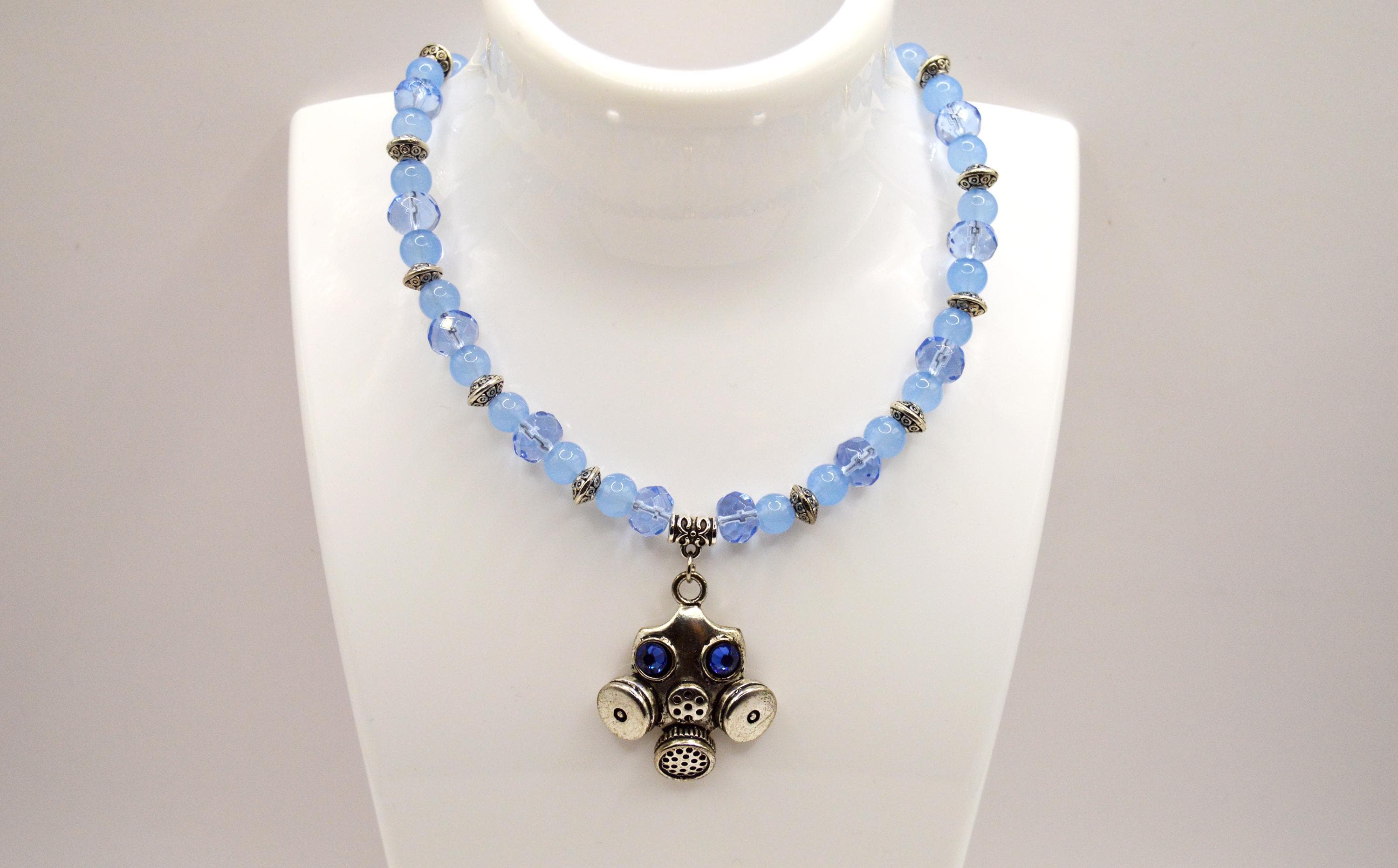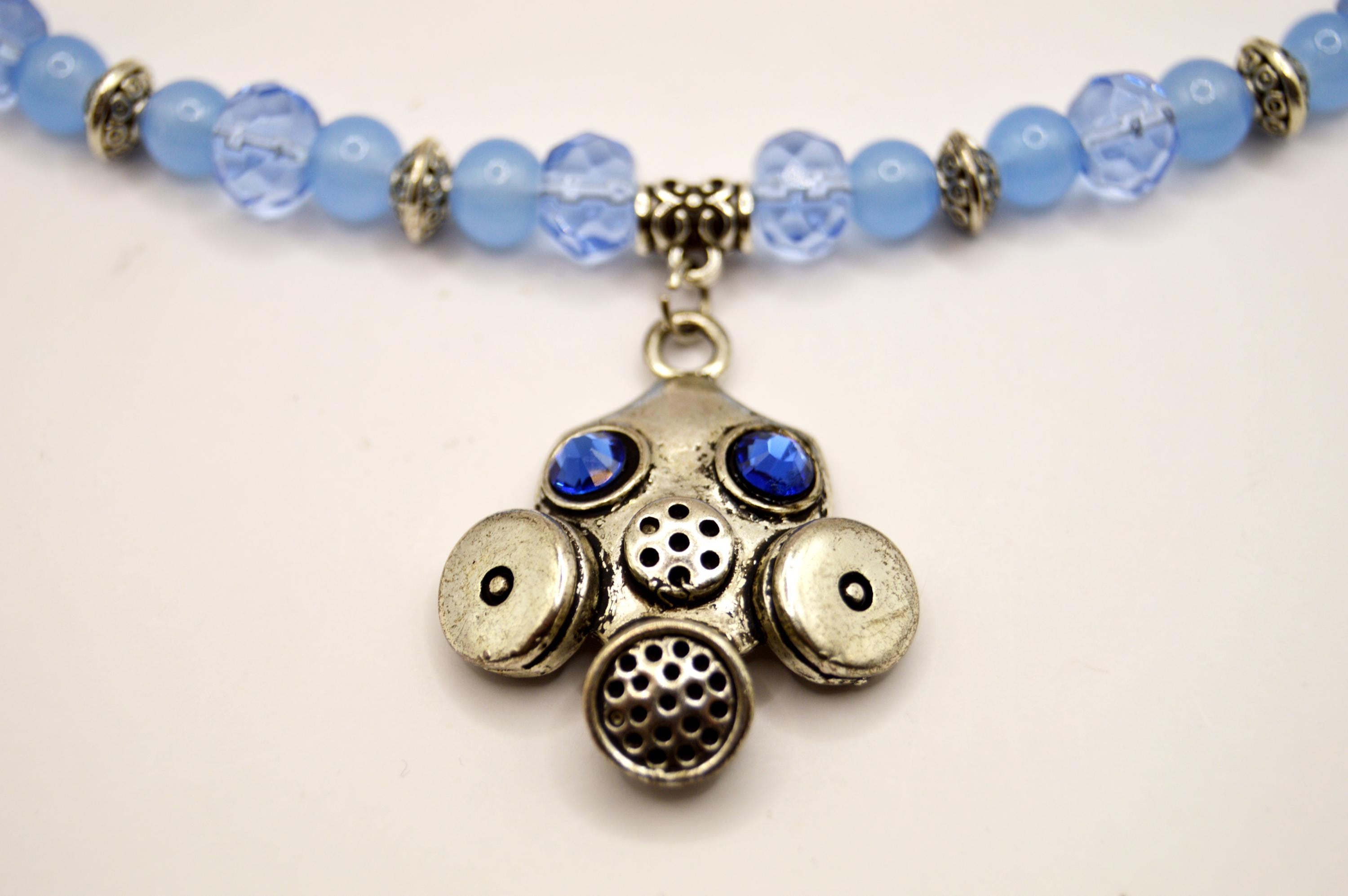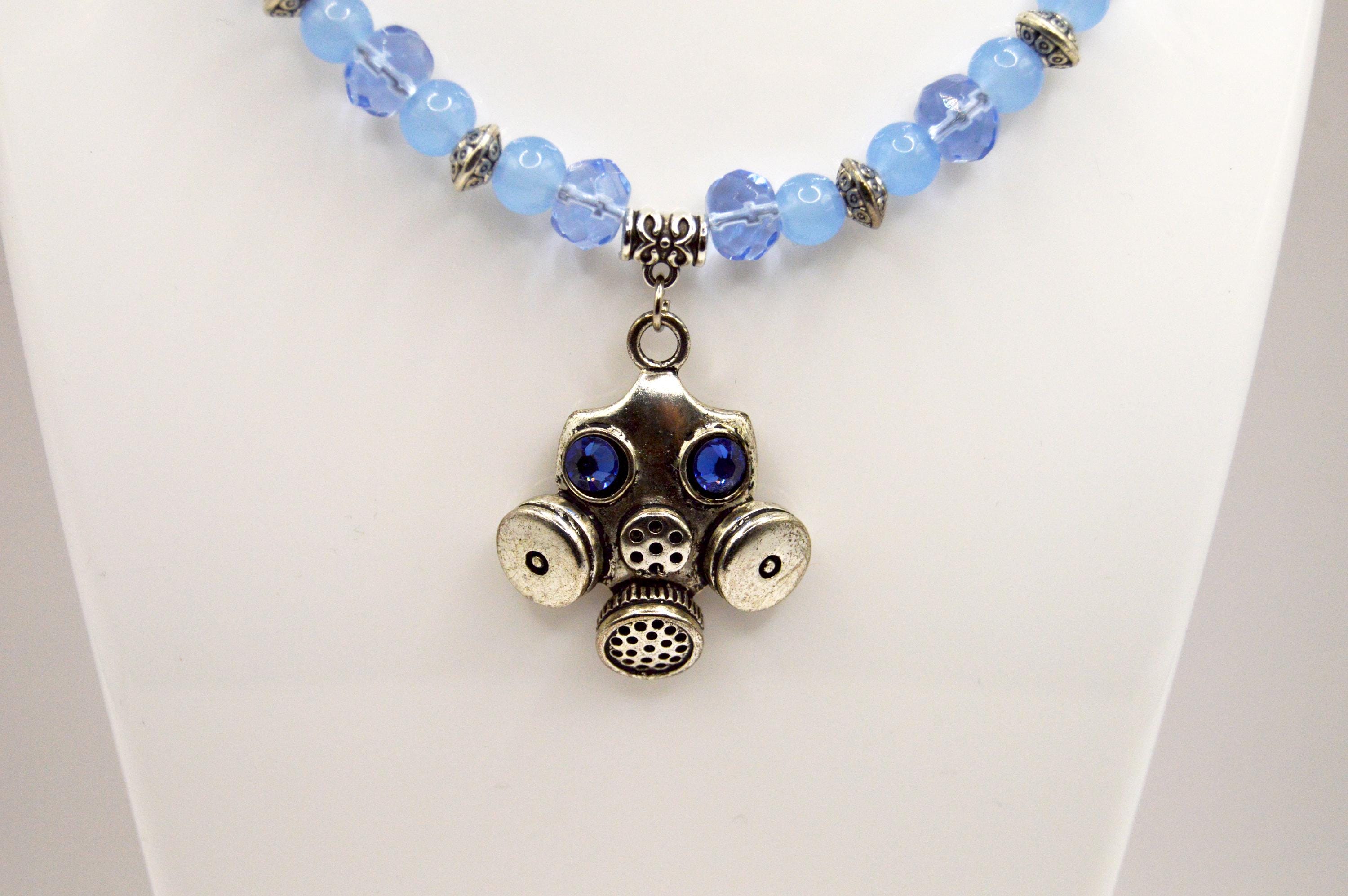 Nuclear Winter inspired Gas Mask Necklace with blue Swarovski crystals.