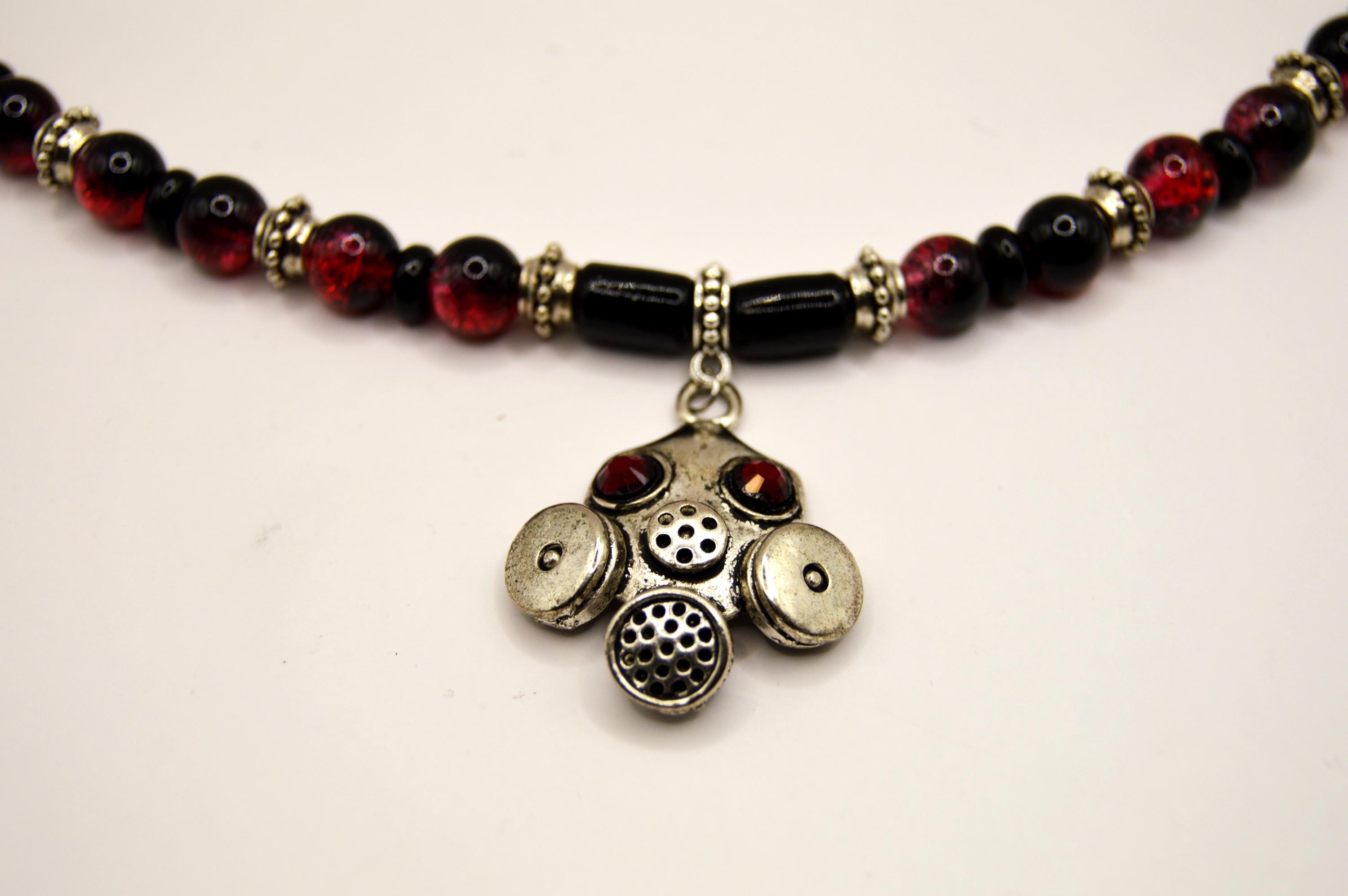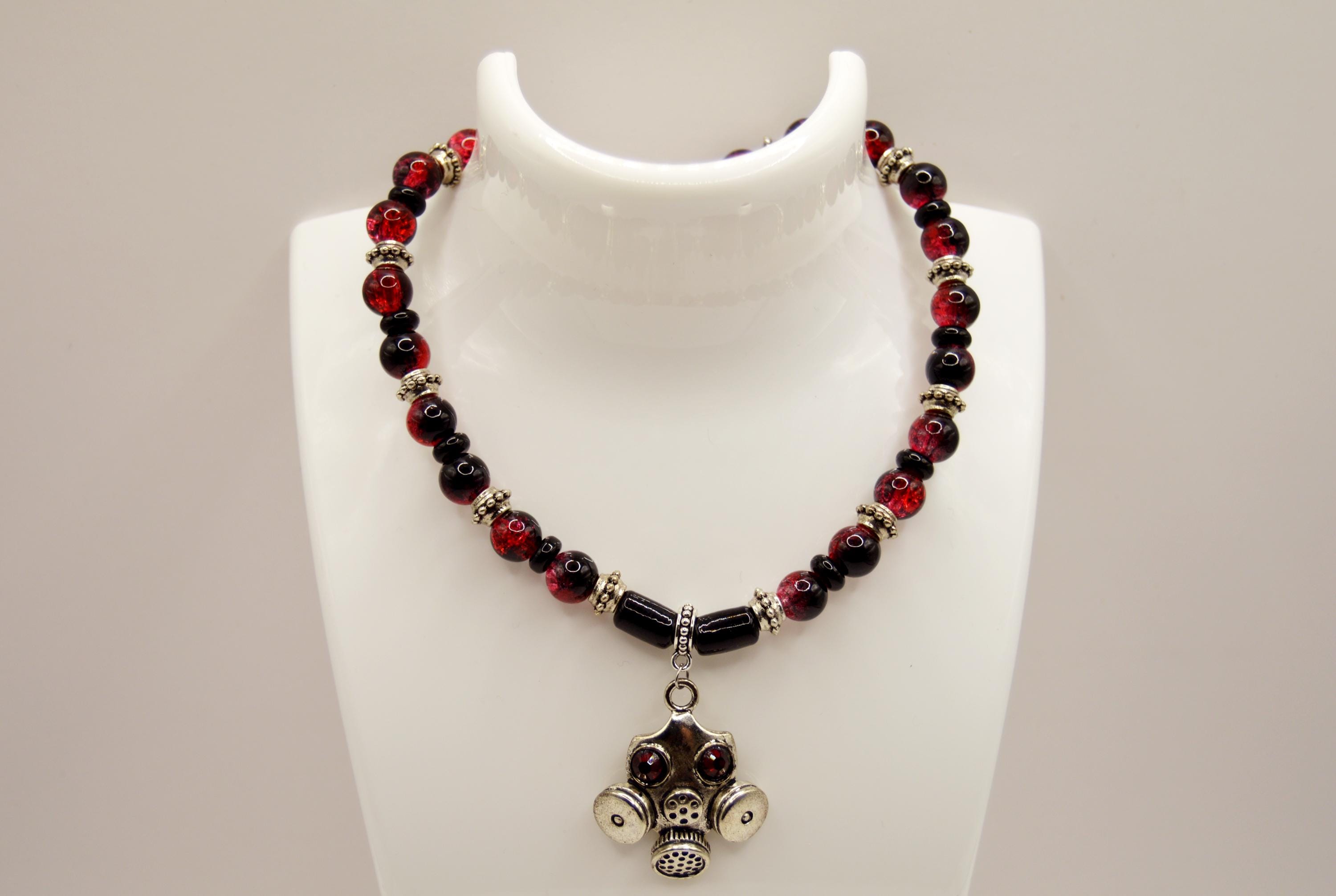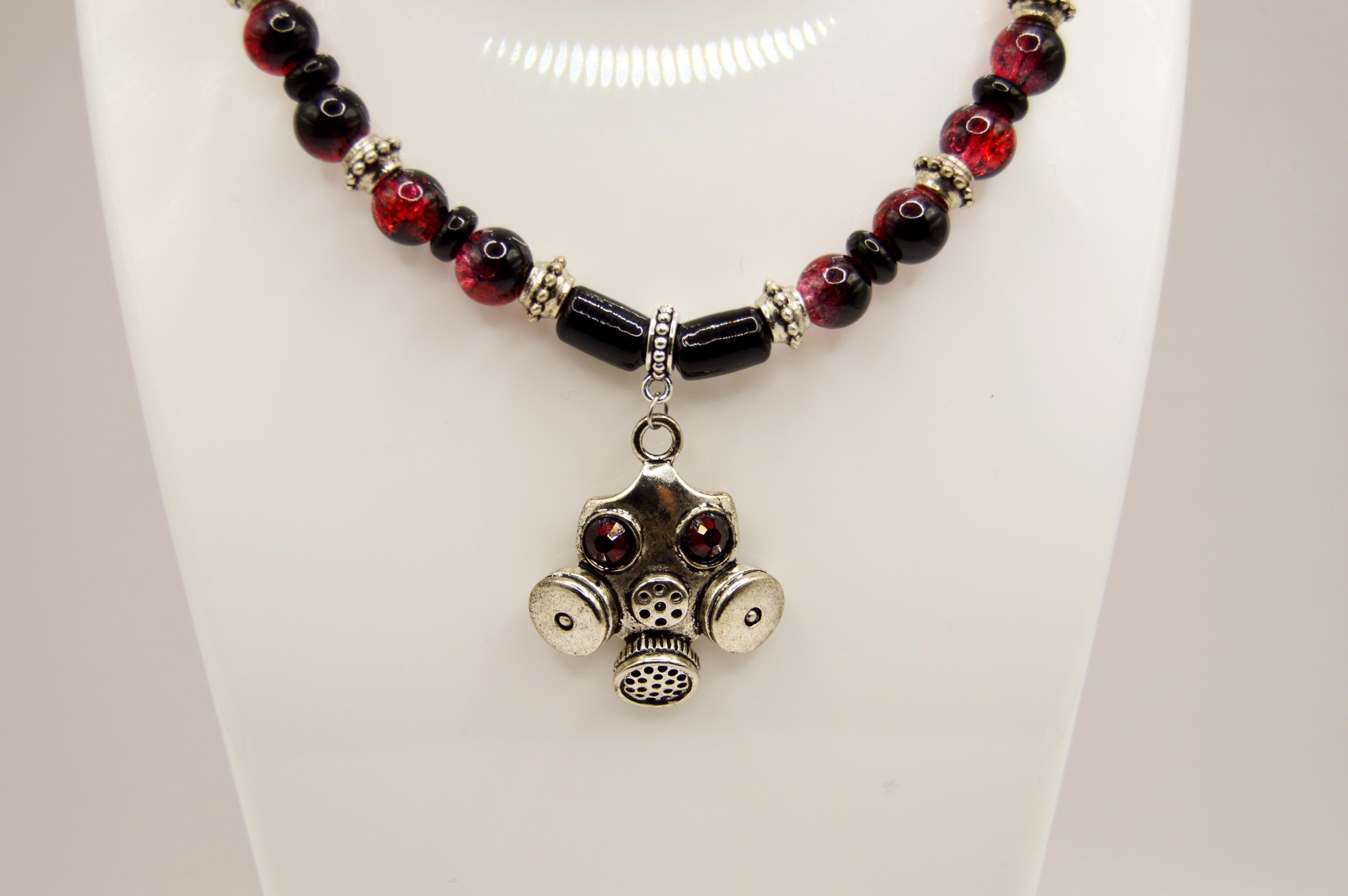 Post Apoctolyptic Gas Mask Necklace with red Swarovski crystals inset in the gas-mask's eyes.