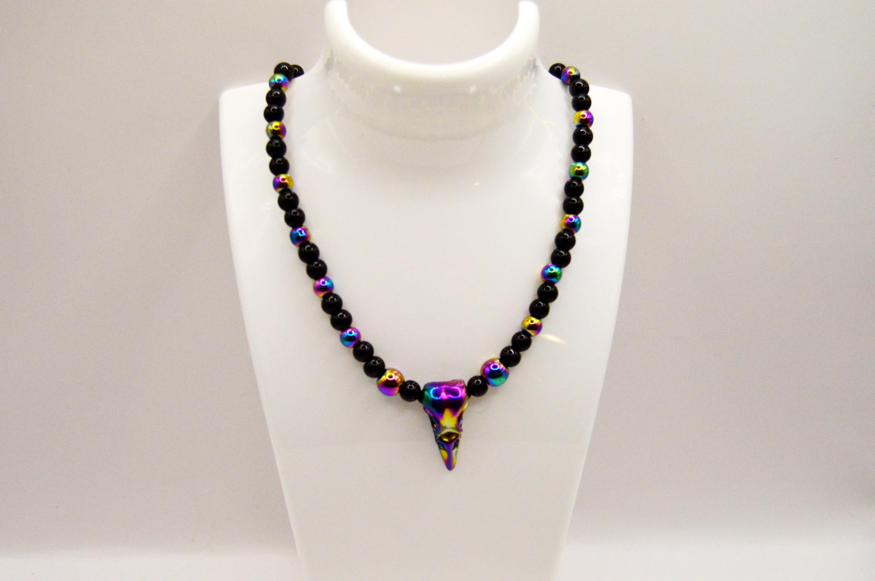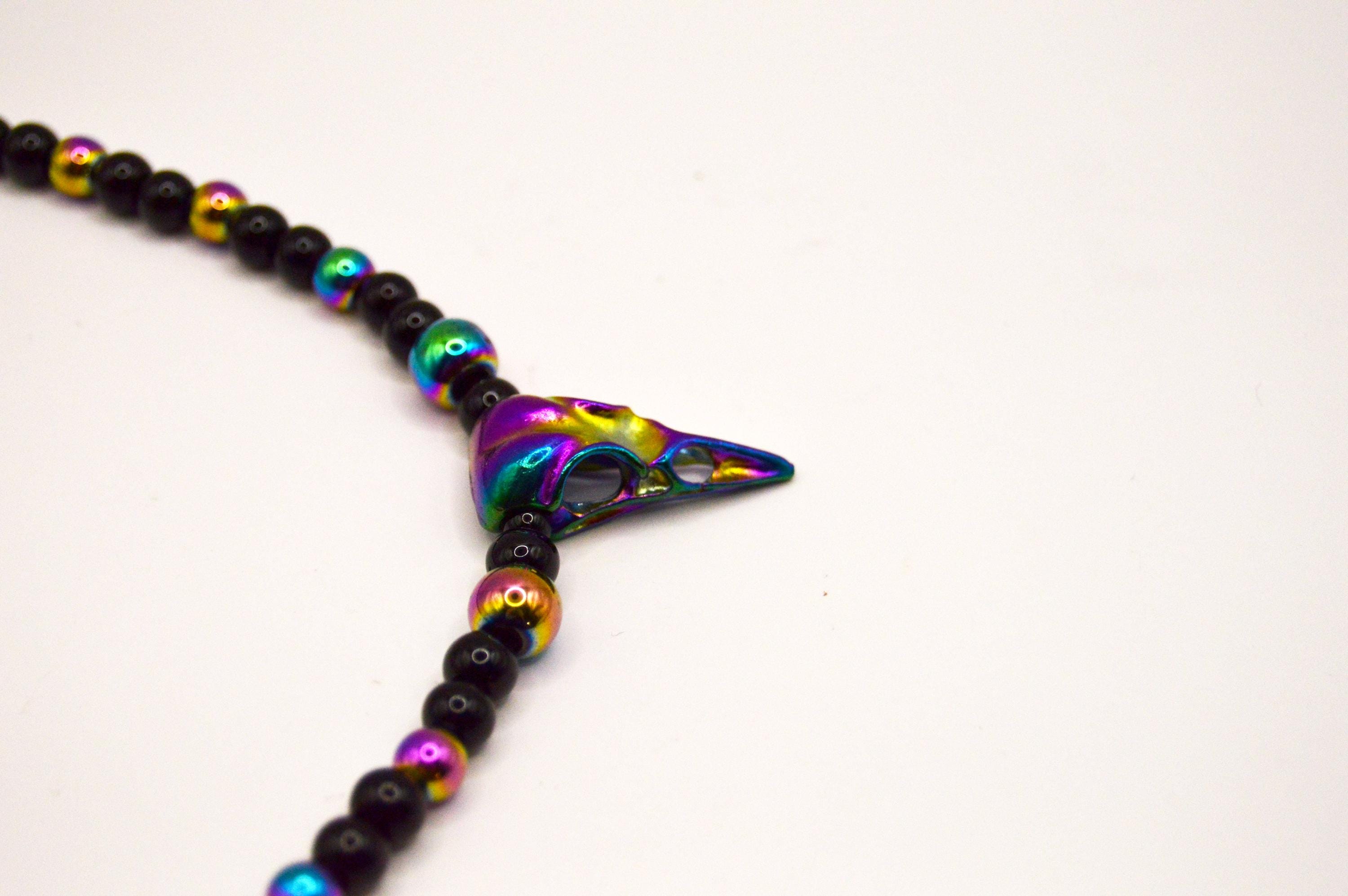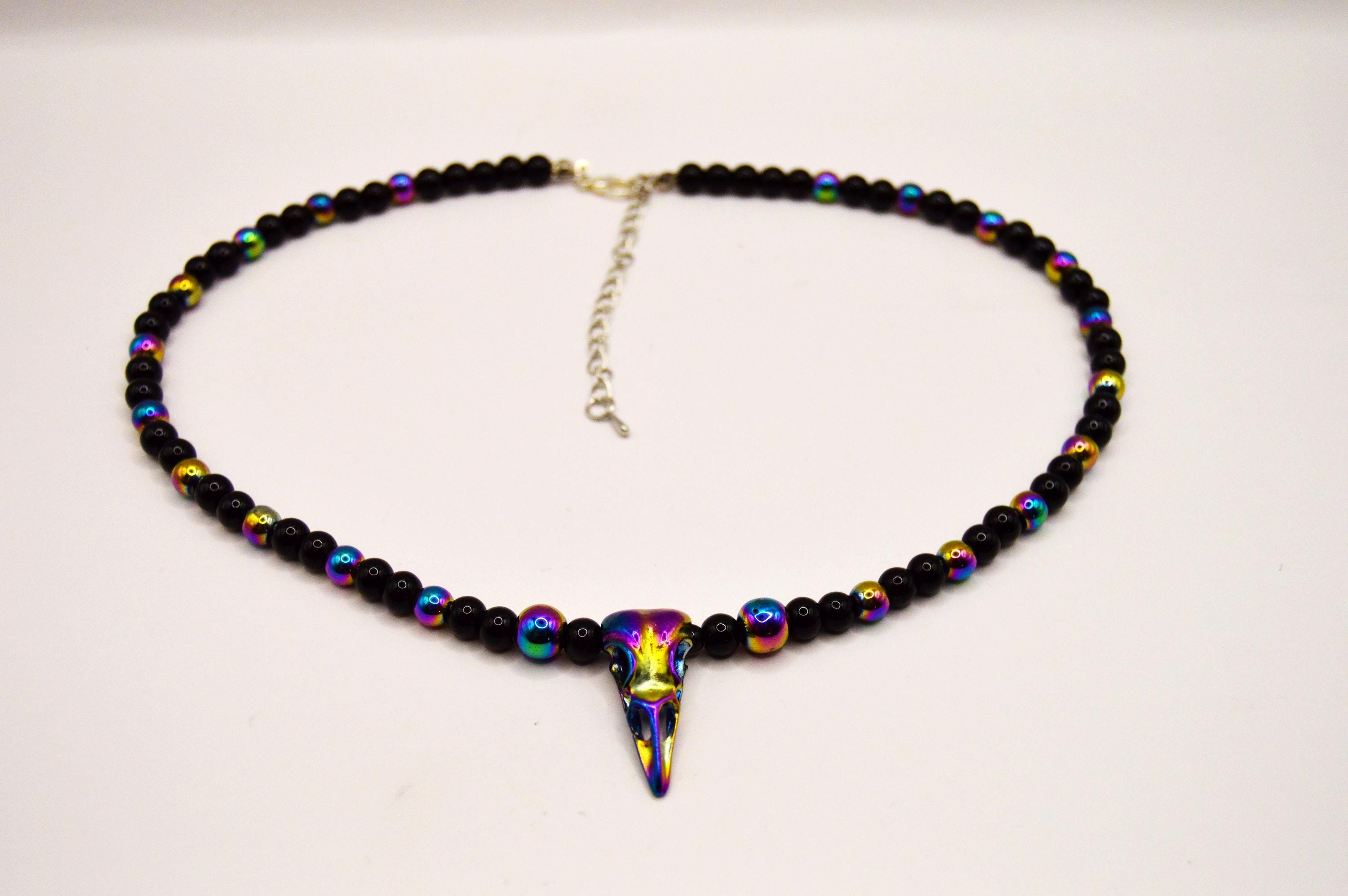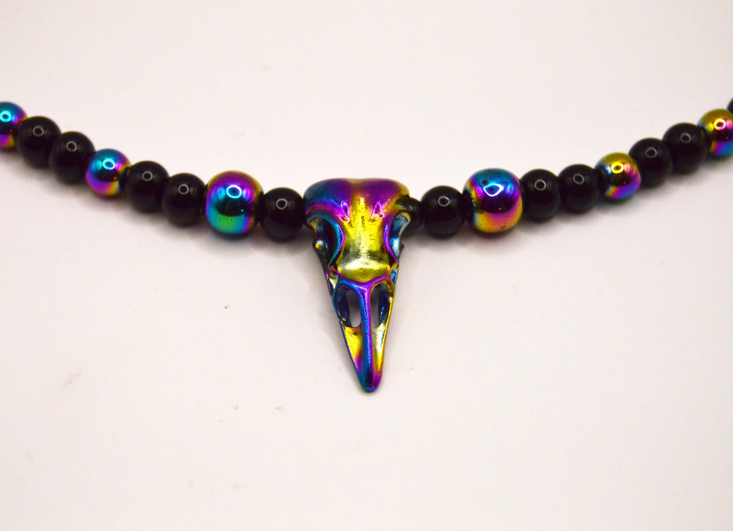 Beautiful black and electroplated Bird skull necklace. If you love gothic jewelry this is a must! If you wear all black this adds just that little touch of color!