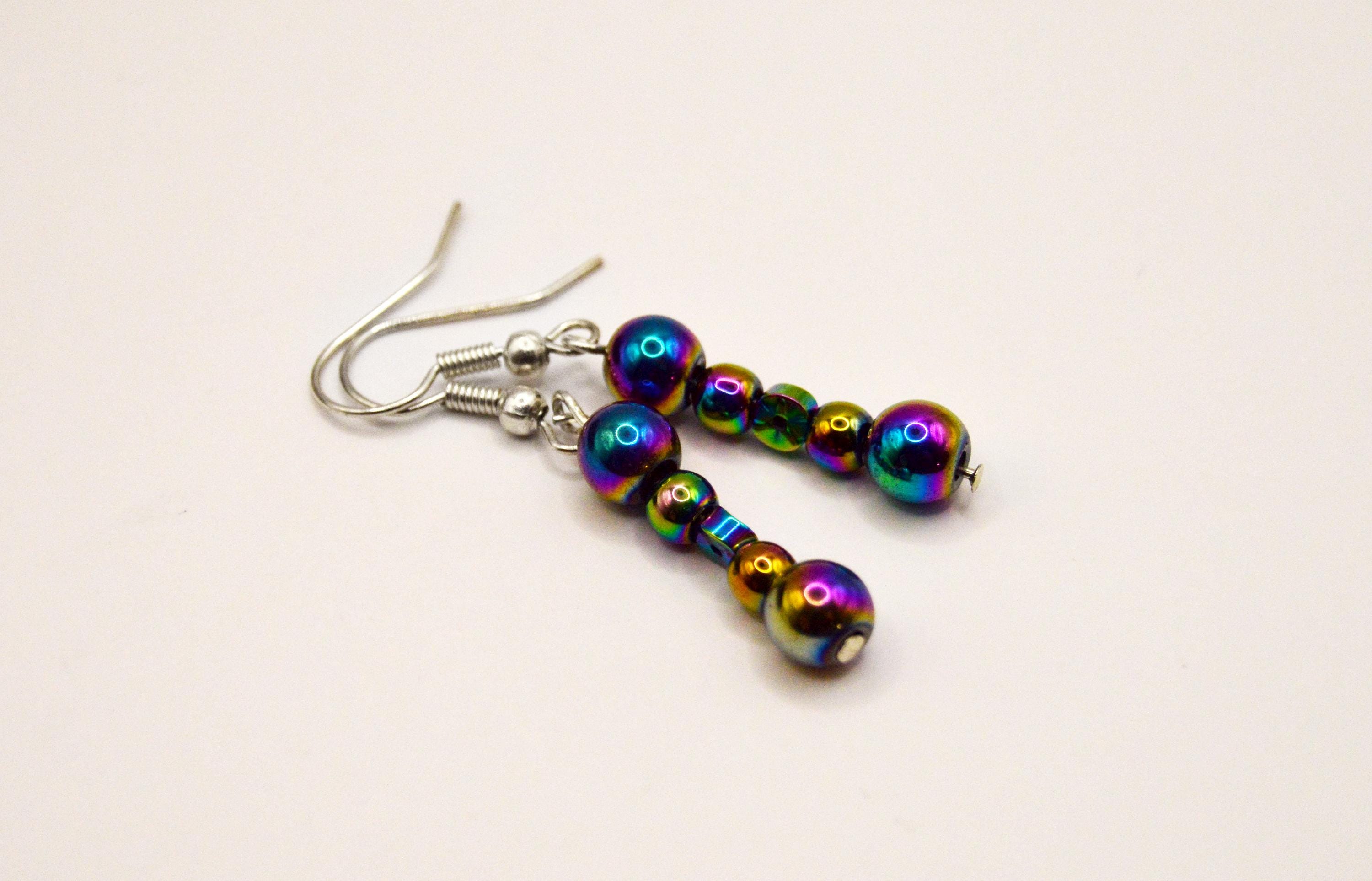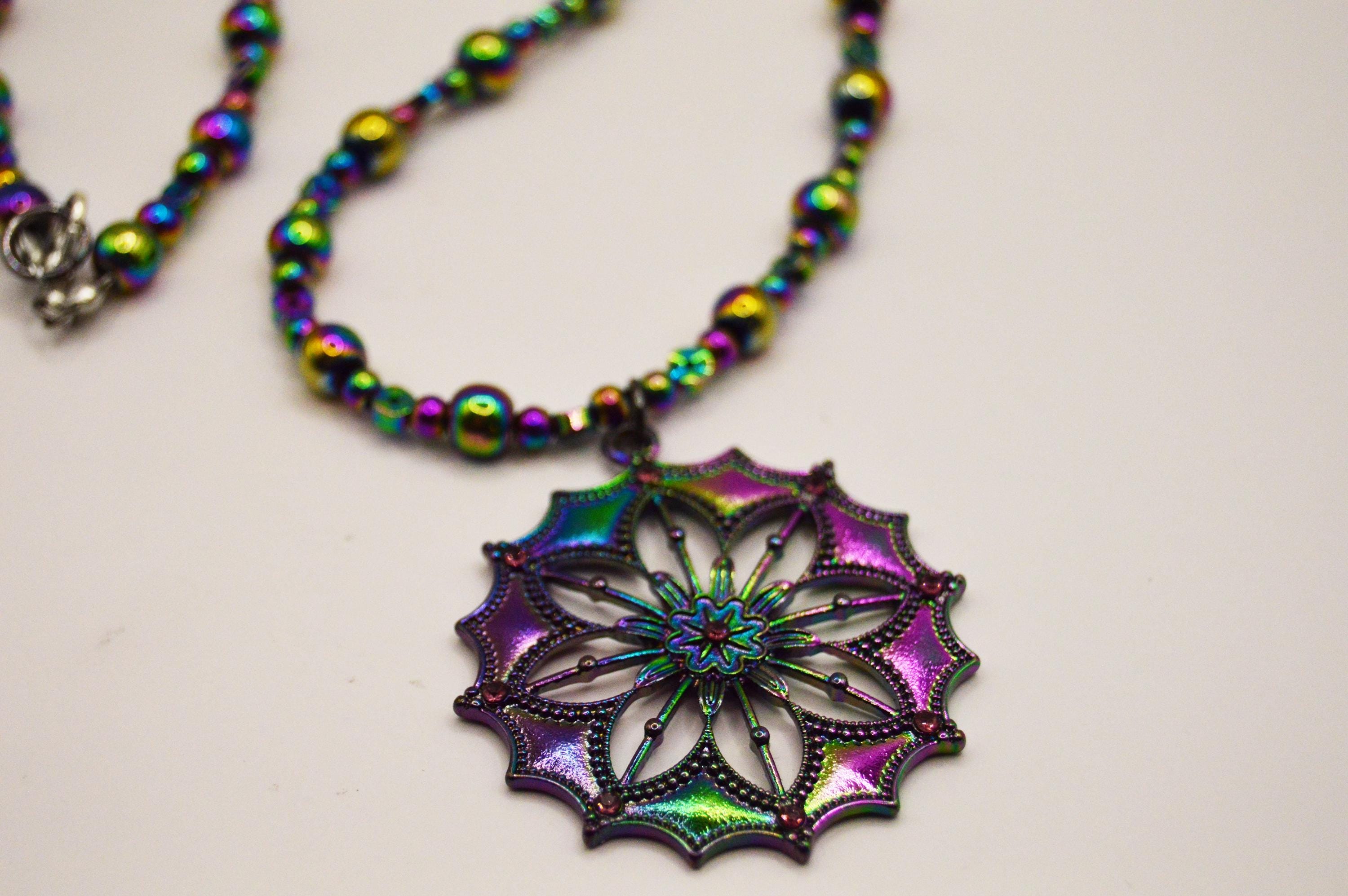 A gorgeous necklace and earrings set. You can wear this with any outfit as it captures every color in the dark metal I used for these!