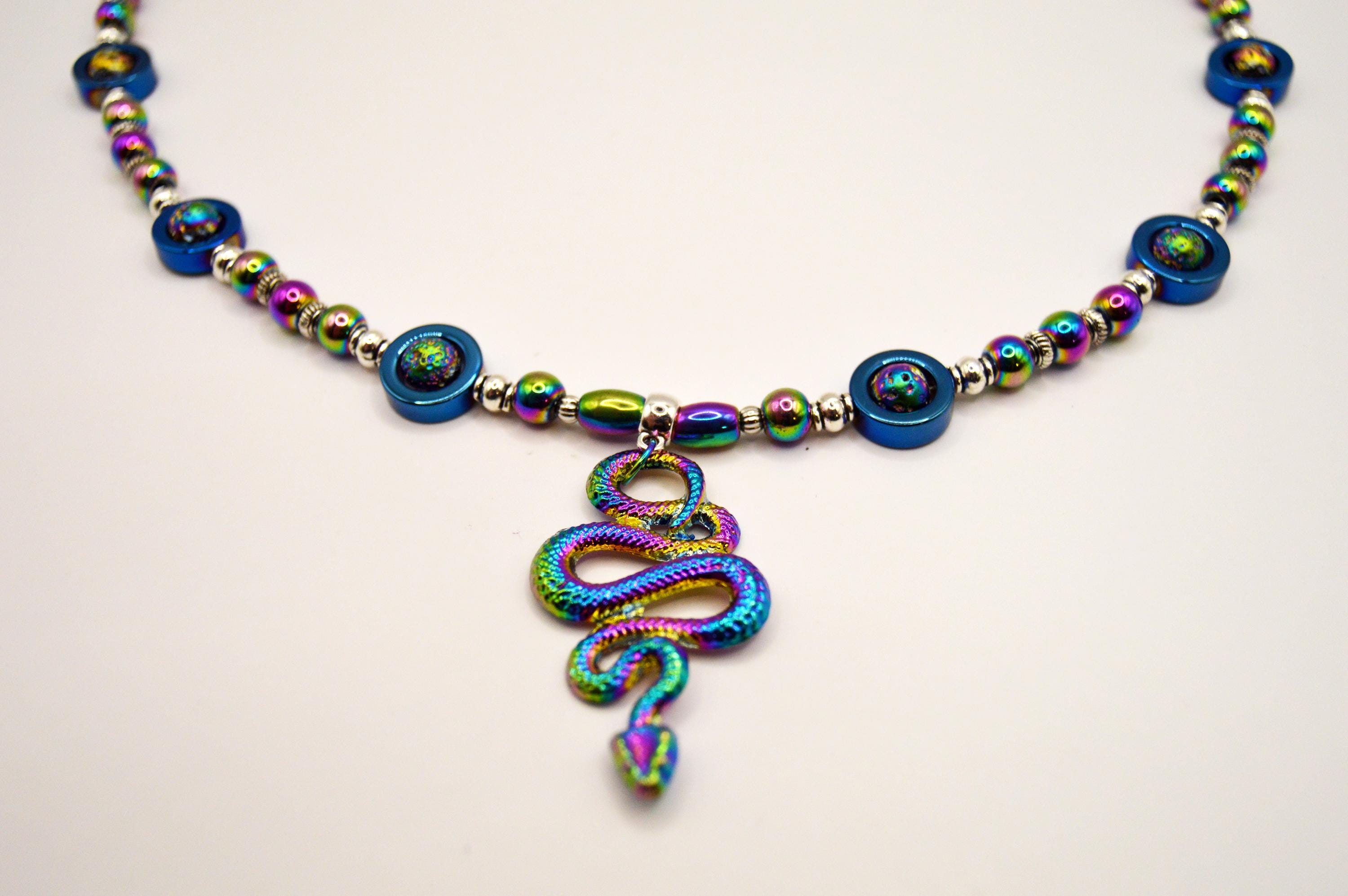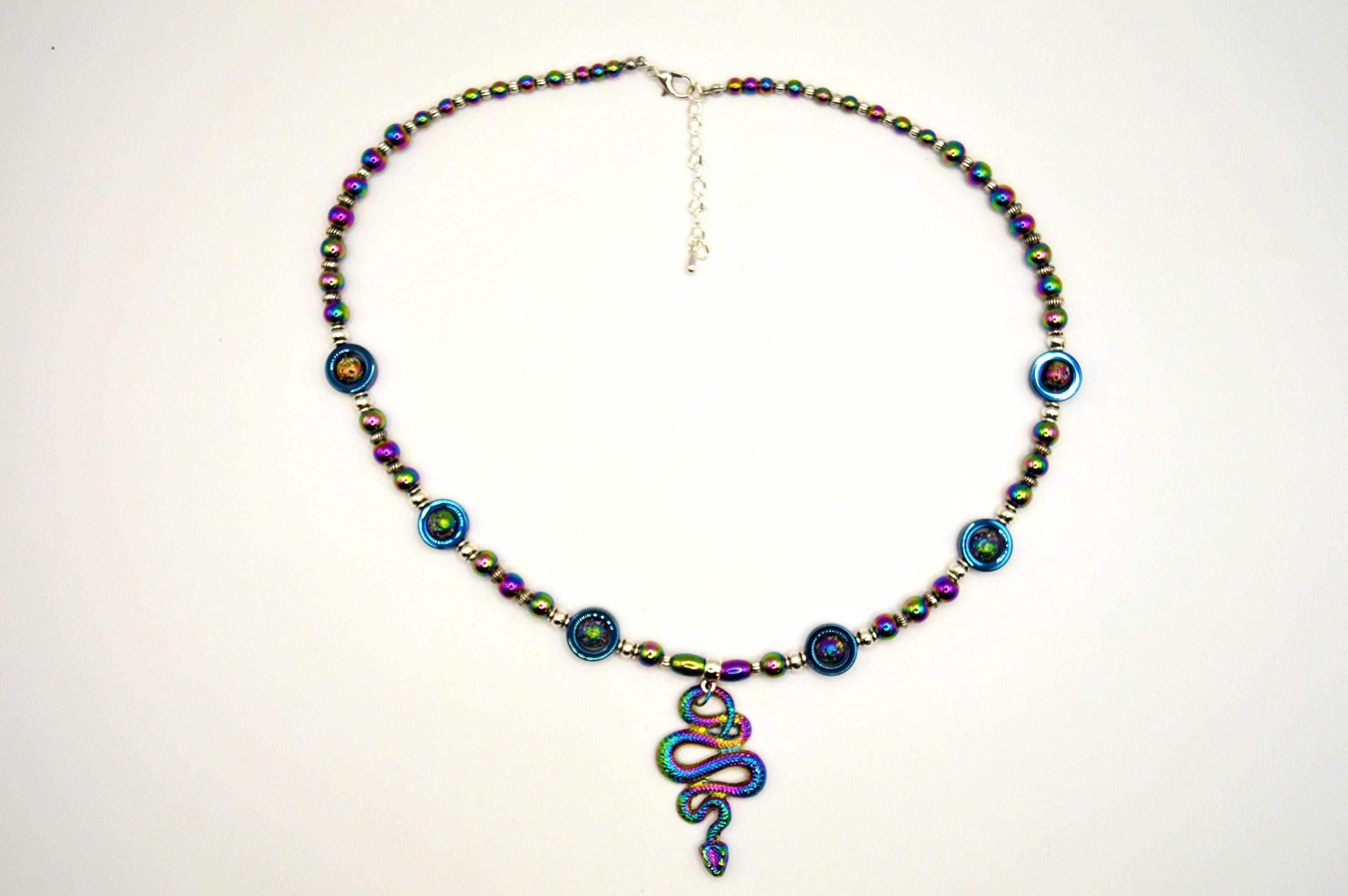 This necklace is a beautiful array of ever-changing colors. It would go with anything and make a great gift for any snake enthusiast.