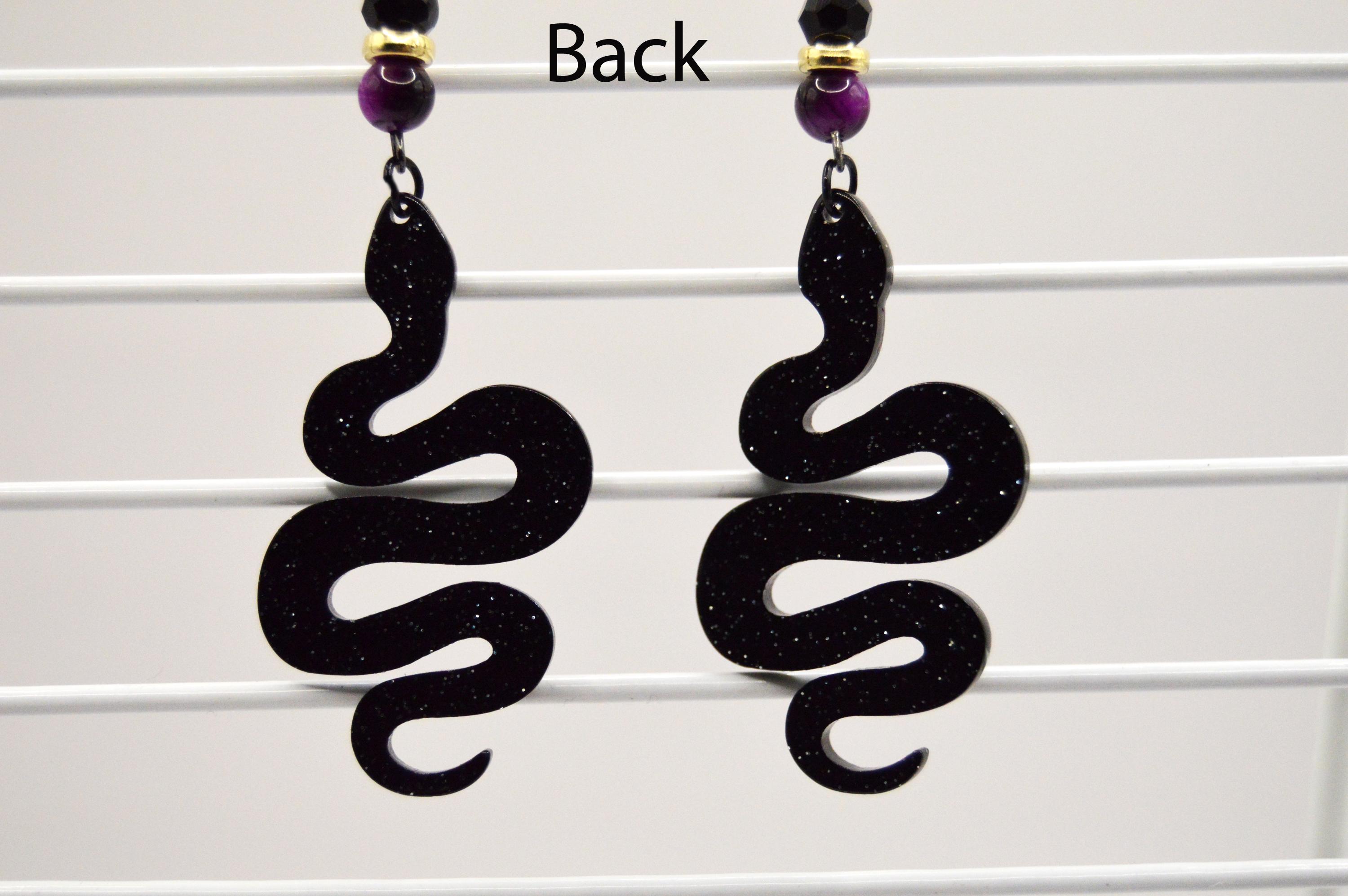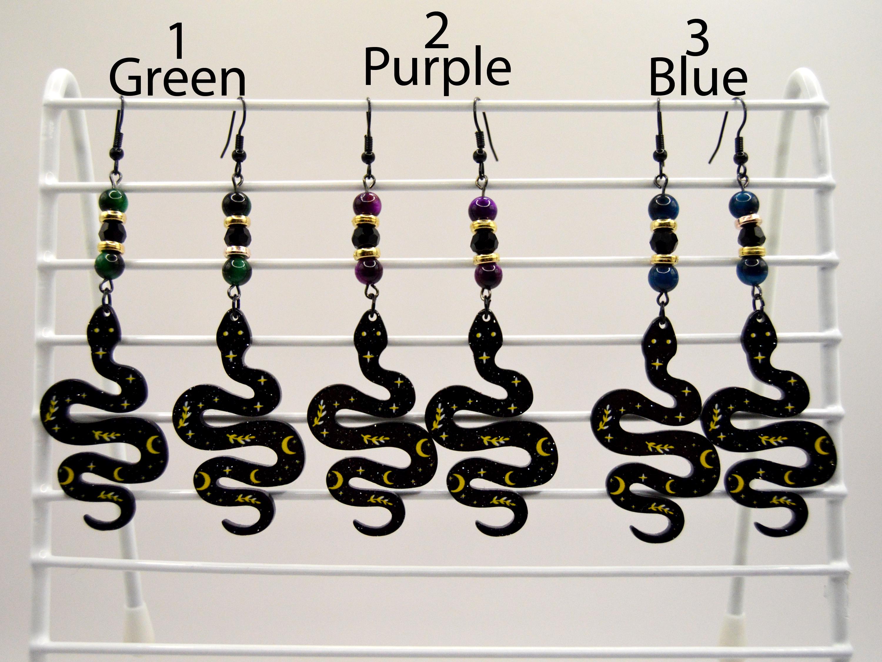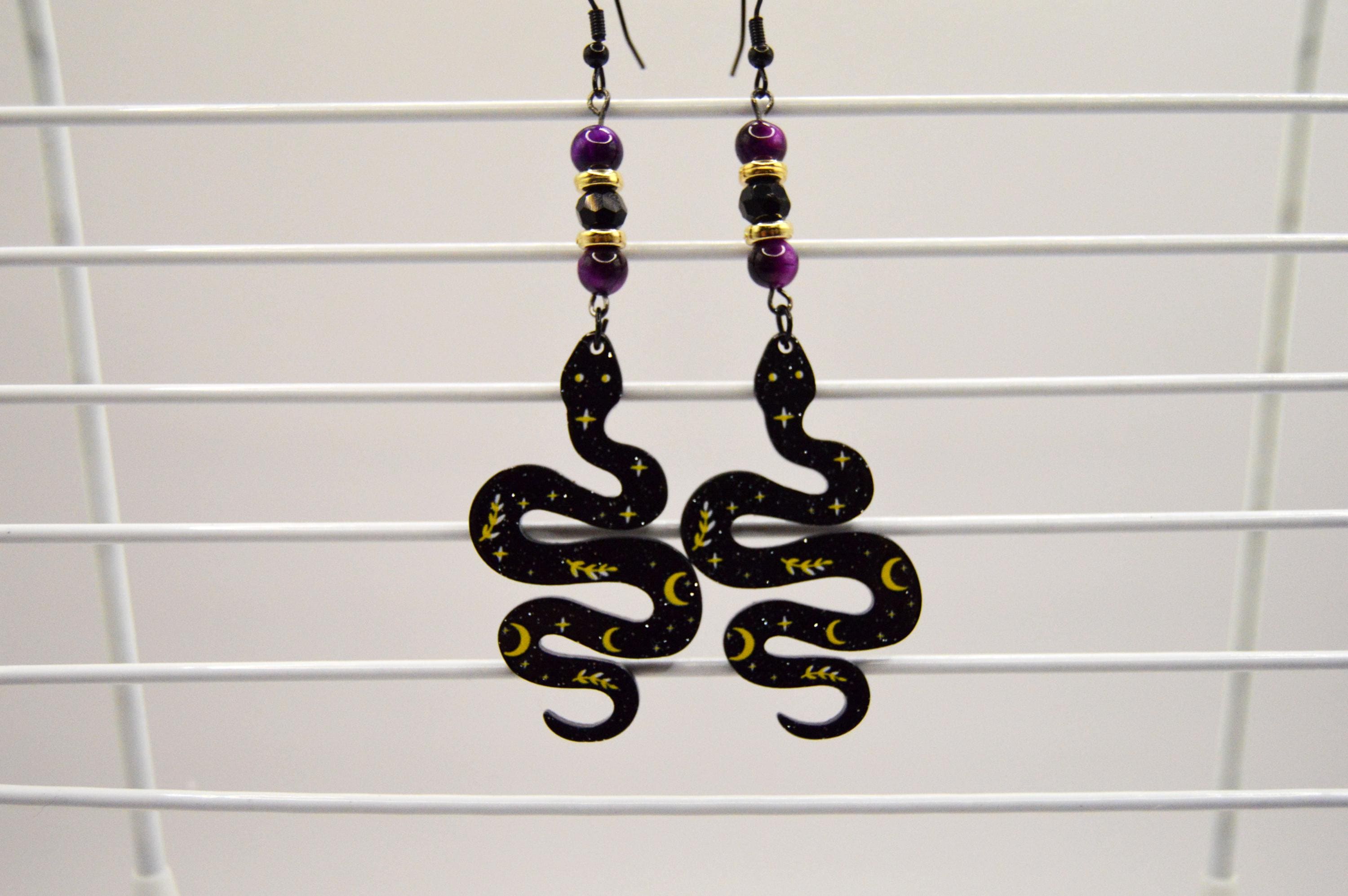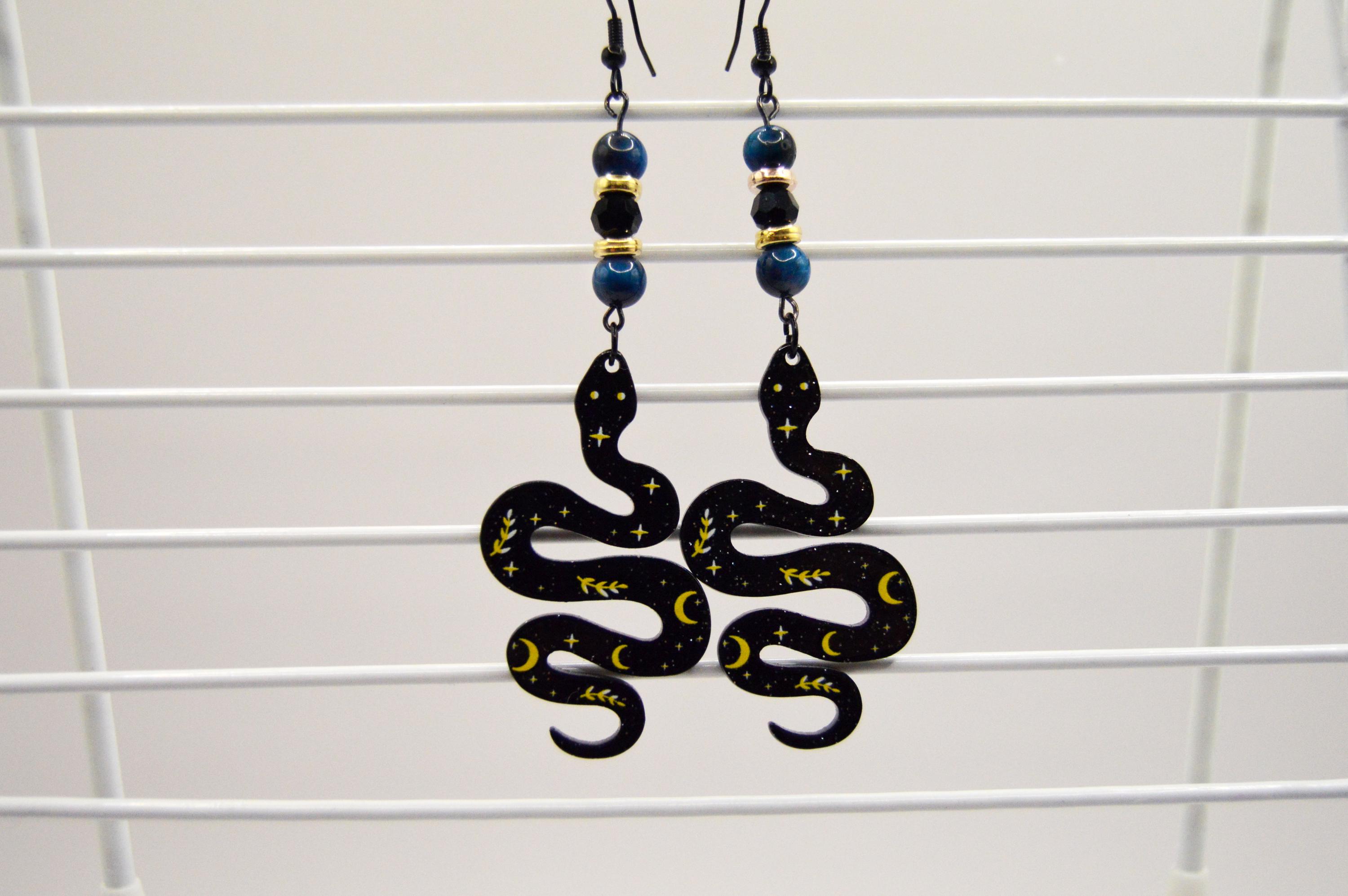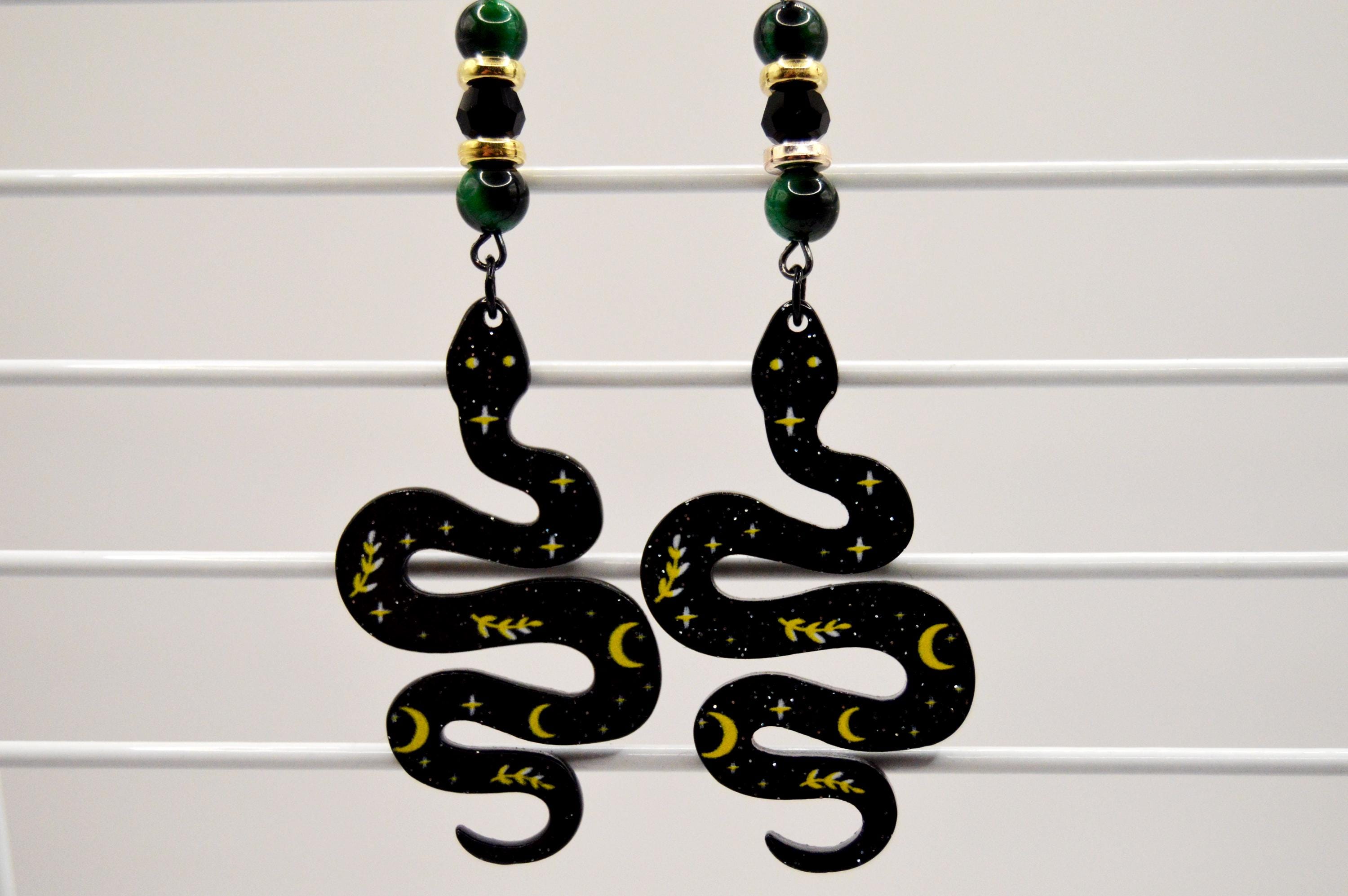 Tiger eye earrings featuring resin Snakes with Celestial pattern.