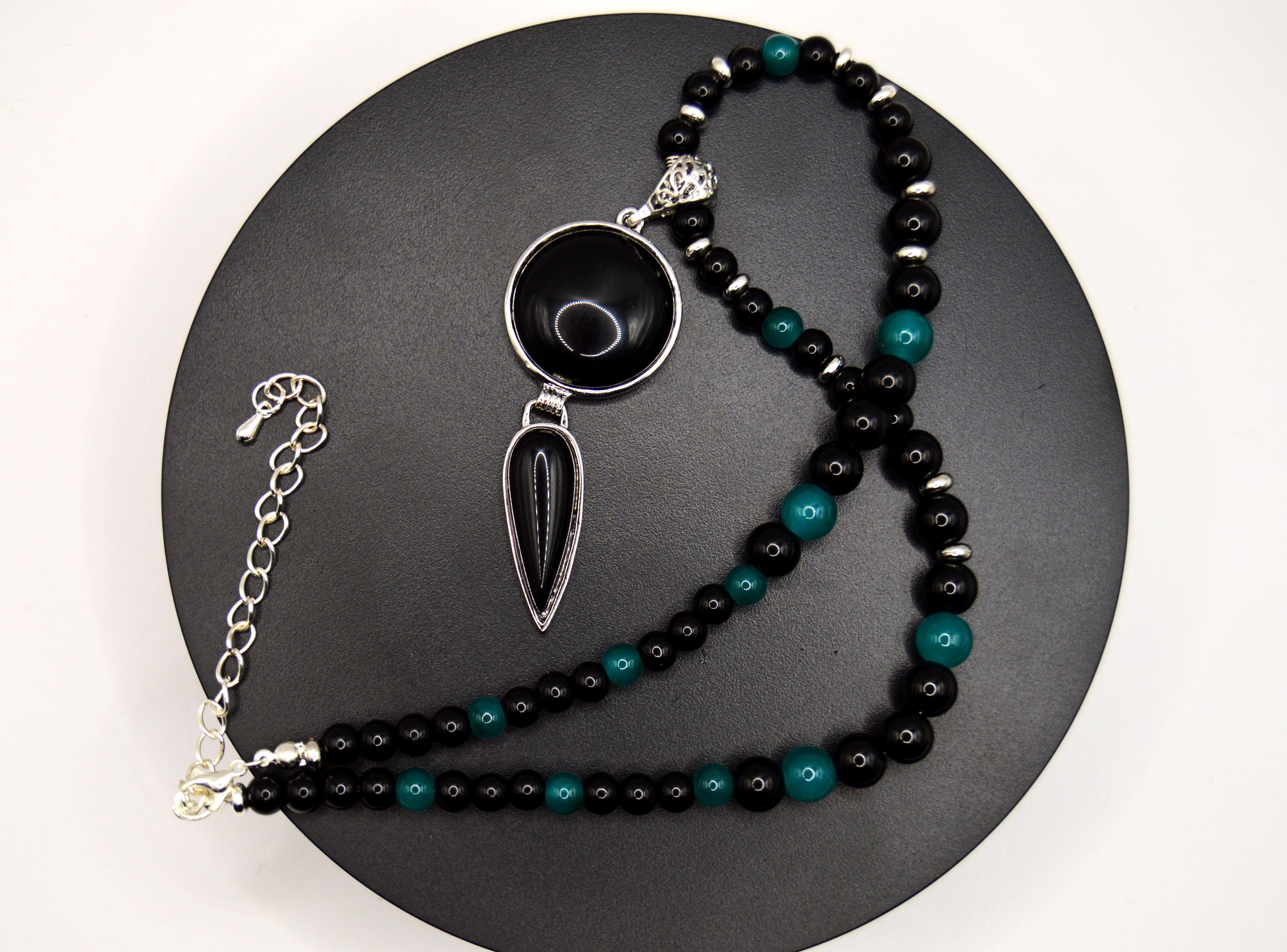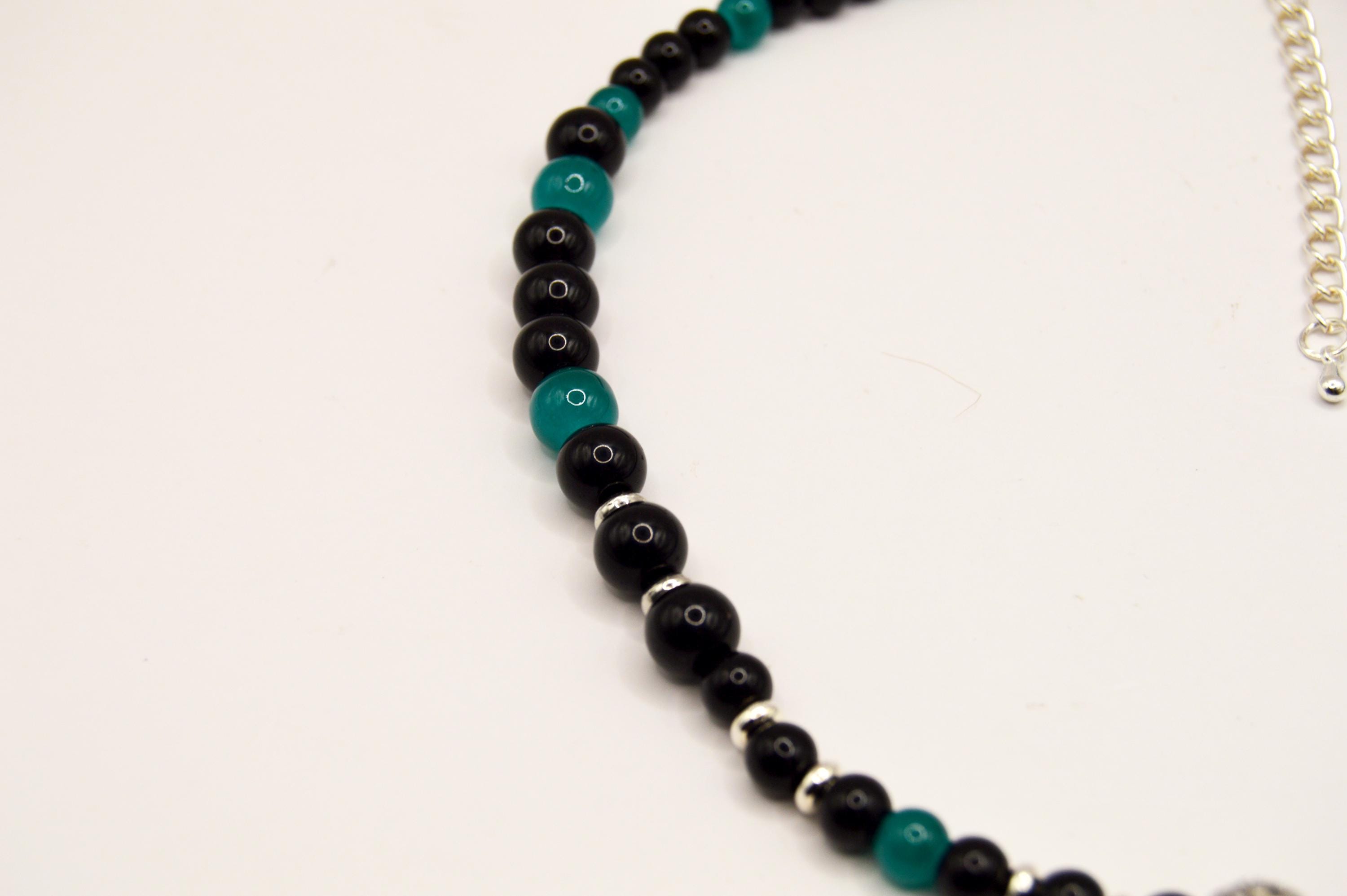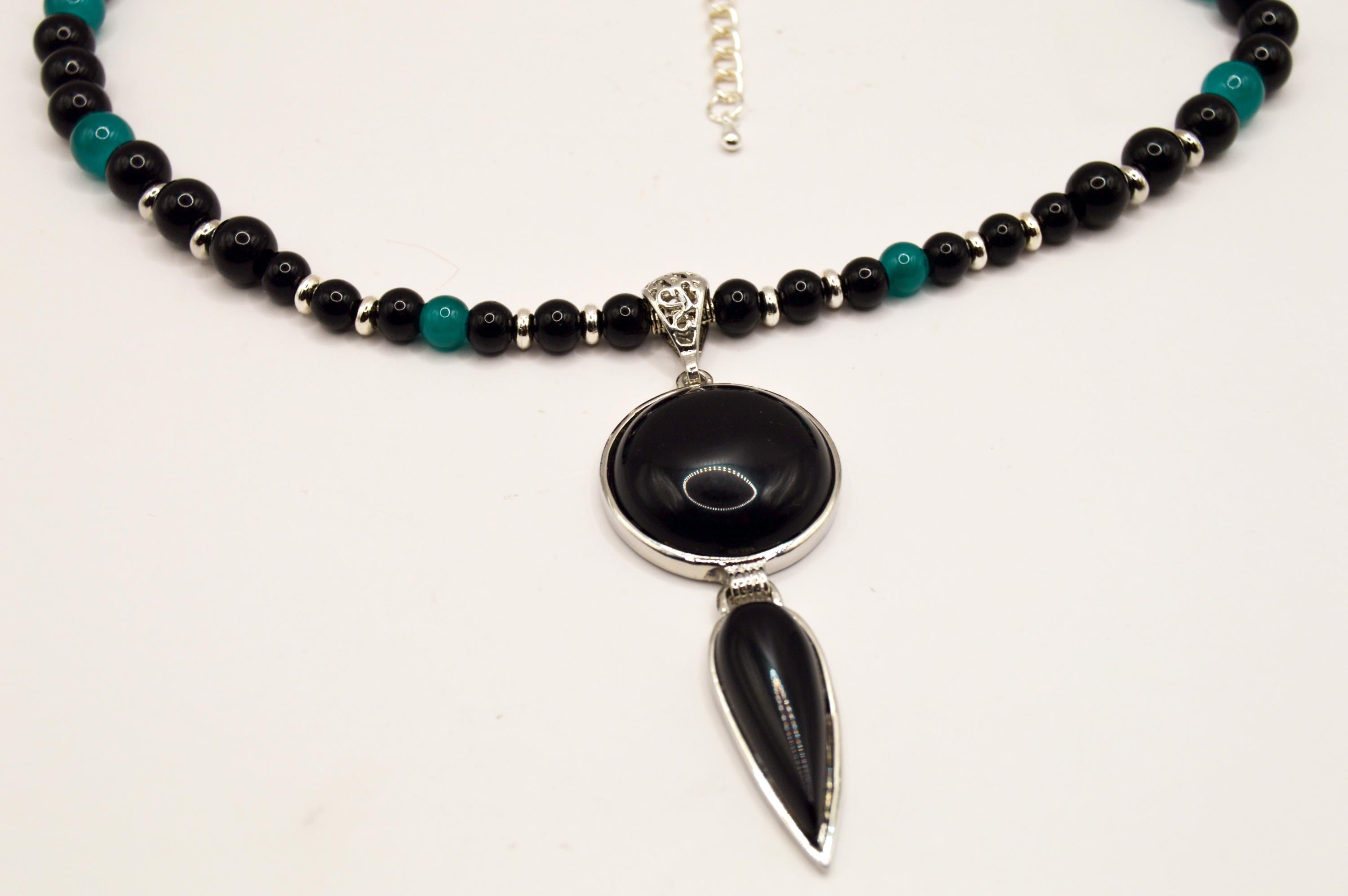 A beautiful 3 inch long, Black Obsidian pendant on a single beaded strand of black and teal Czech beads.