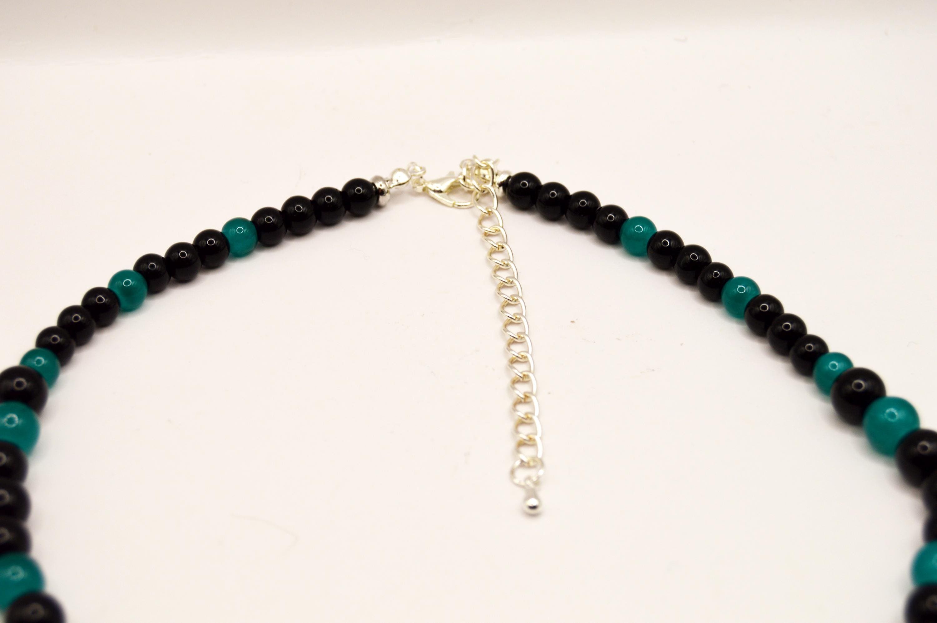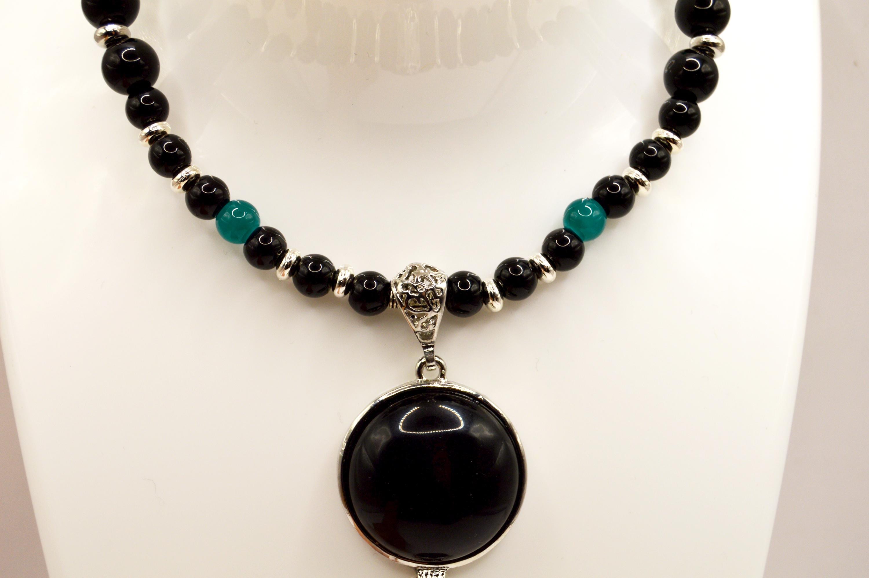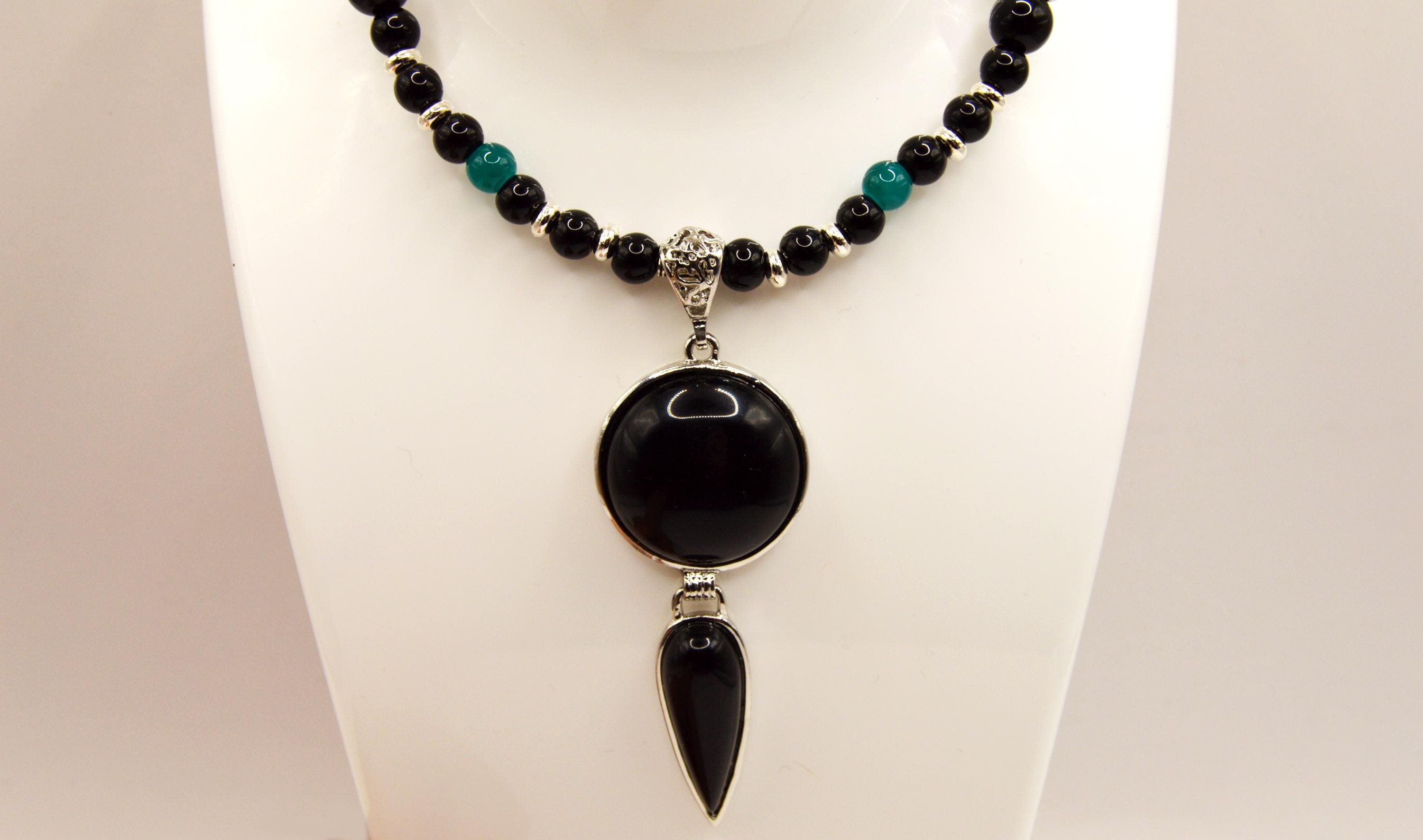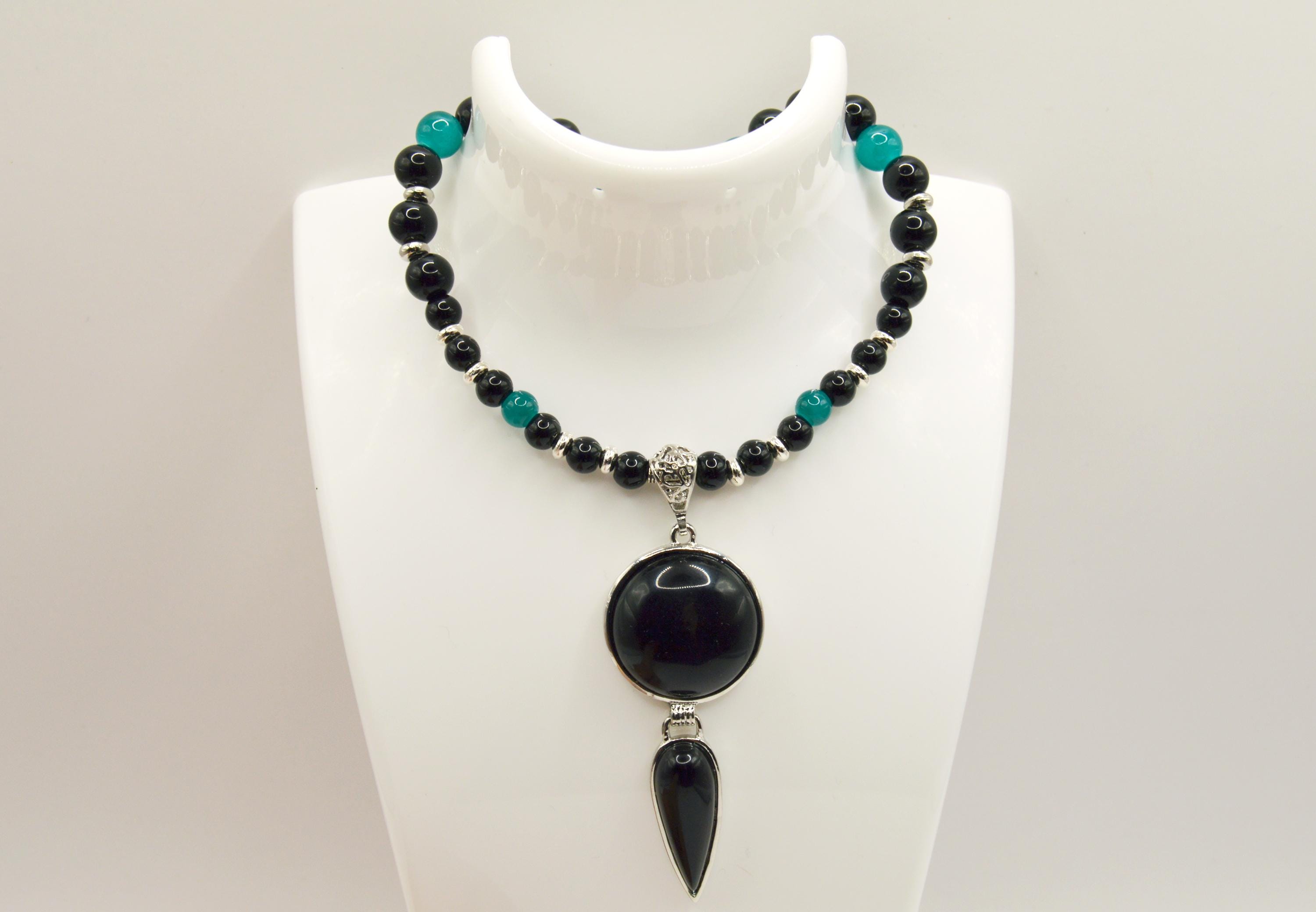 A beautiful 3 inch long, Black Obsidian pendant on a single beaded strand of black and teal Czech beads.