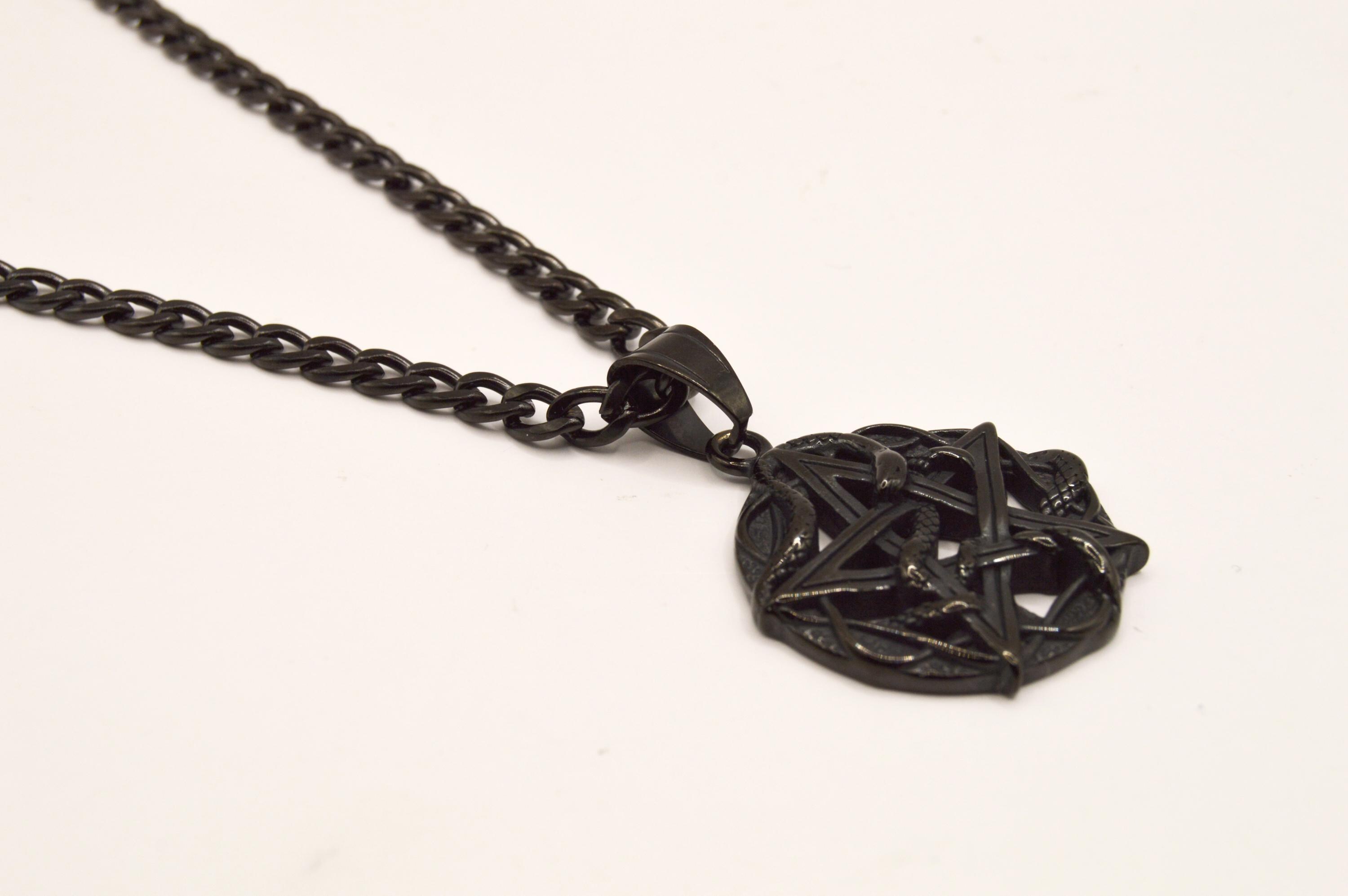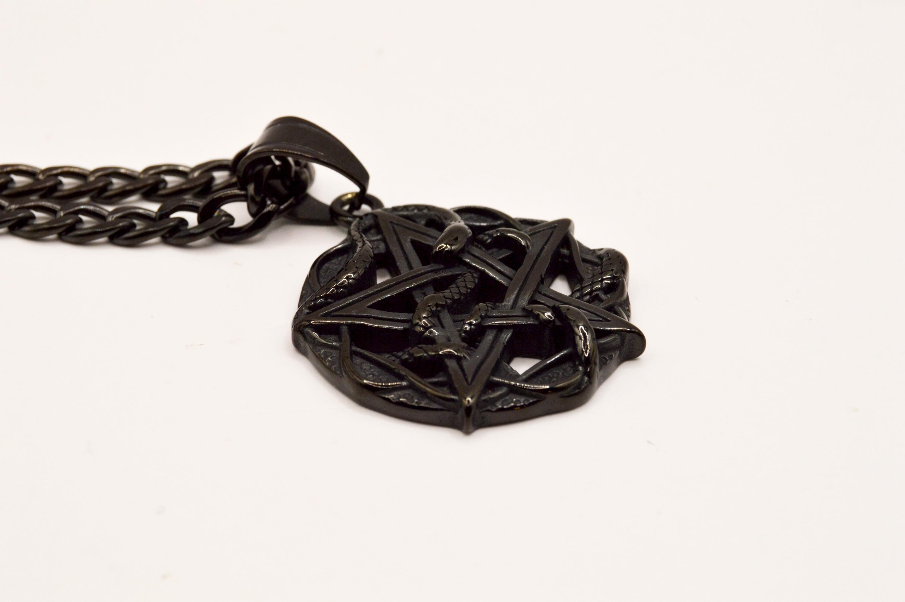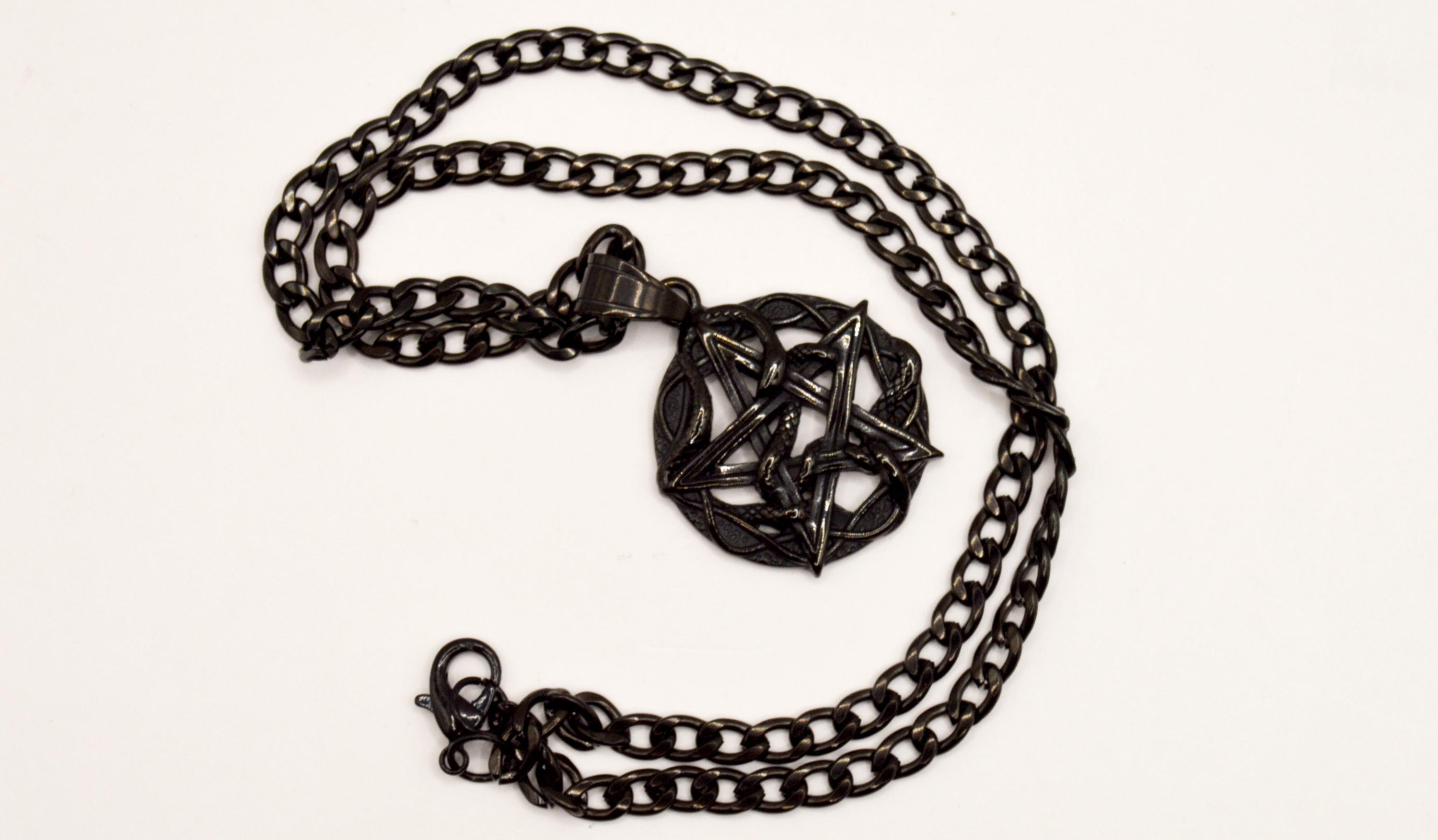 Beautifully carved black, Obsidian pentacle with snakes is hanging on a black enamel coated stainless steel box chain.