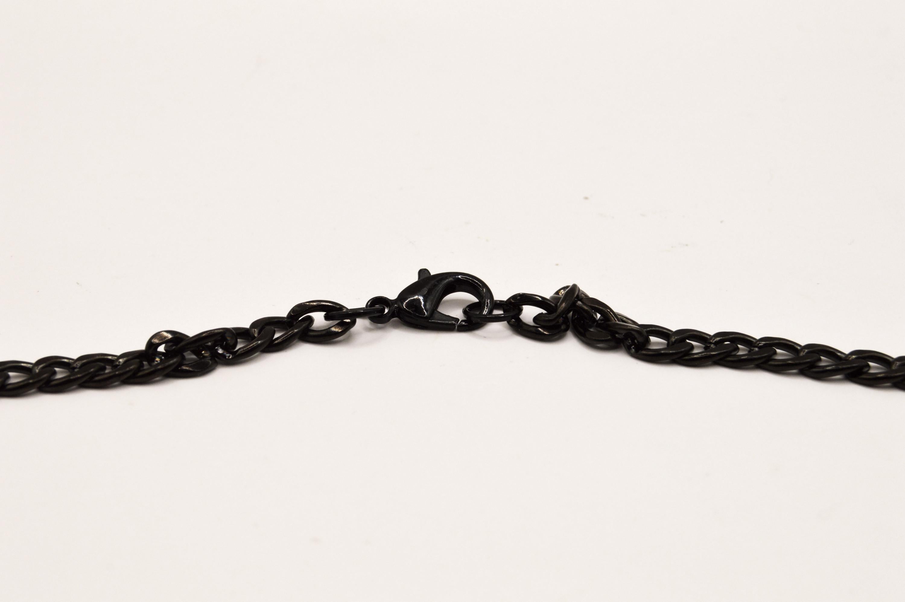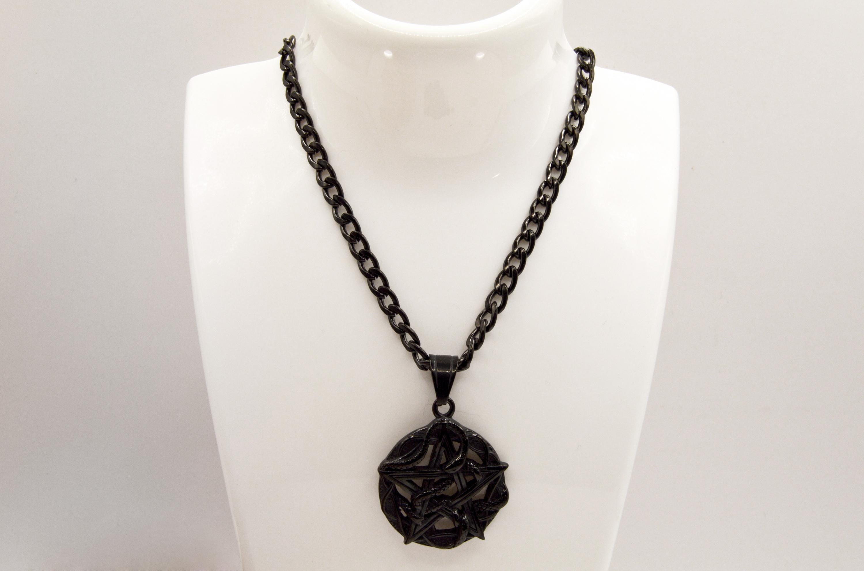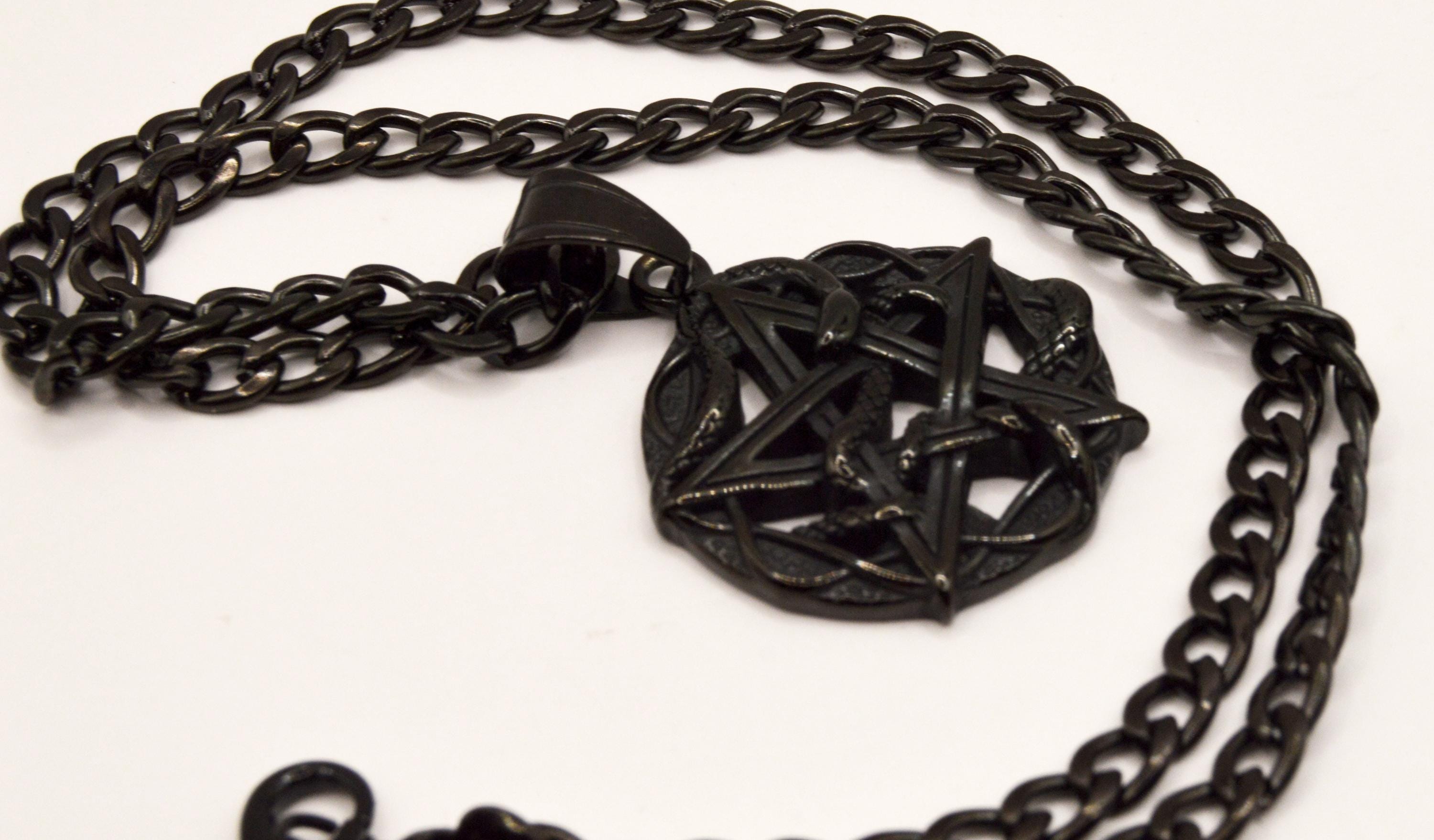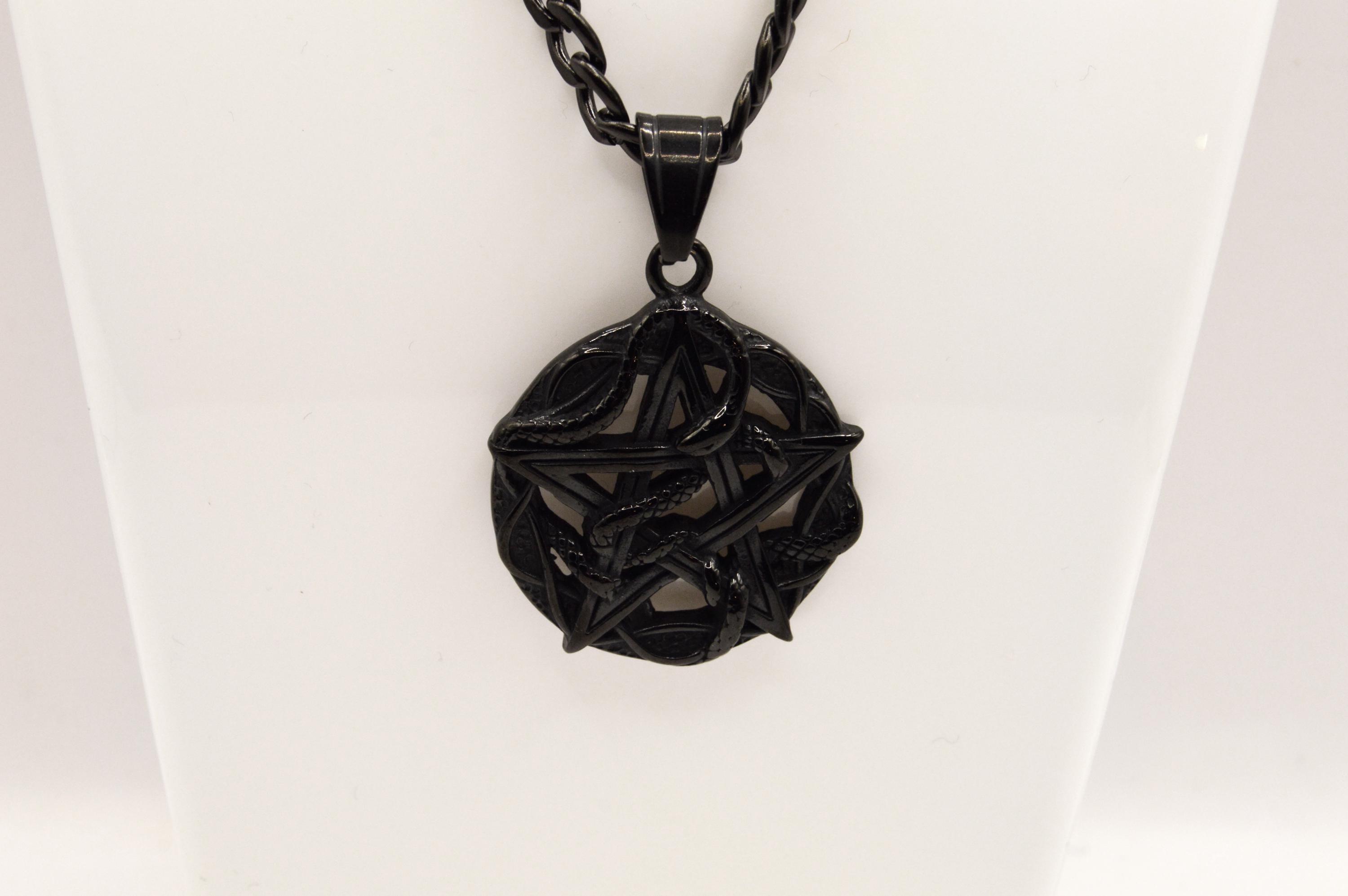 Beautifully carved black, Obsidian pentacle with snakes is hanging on a black enamel coated stainless steel box chain.