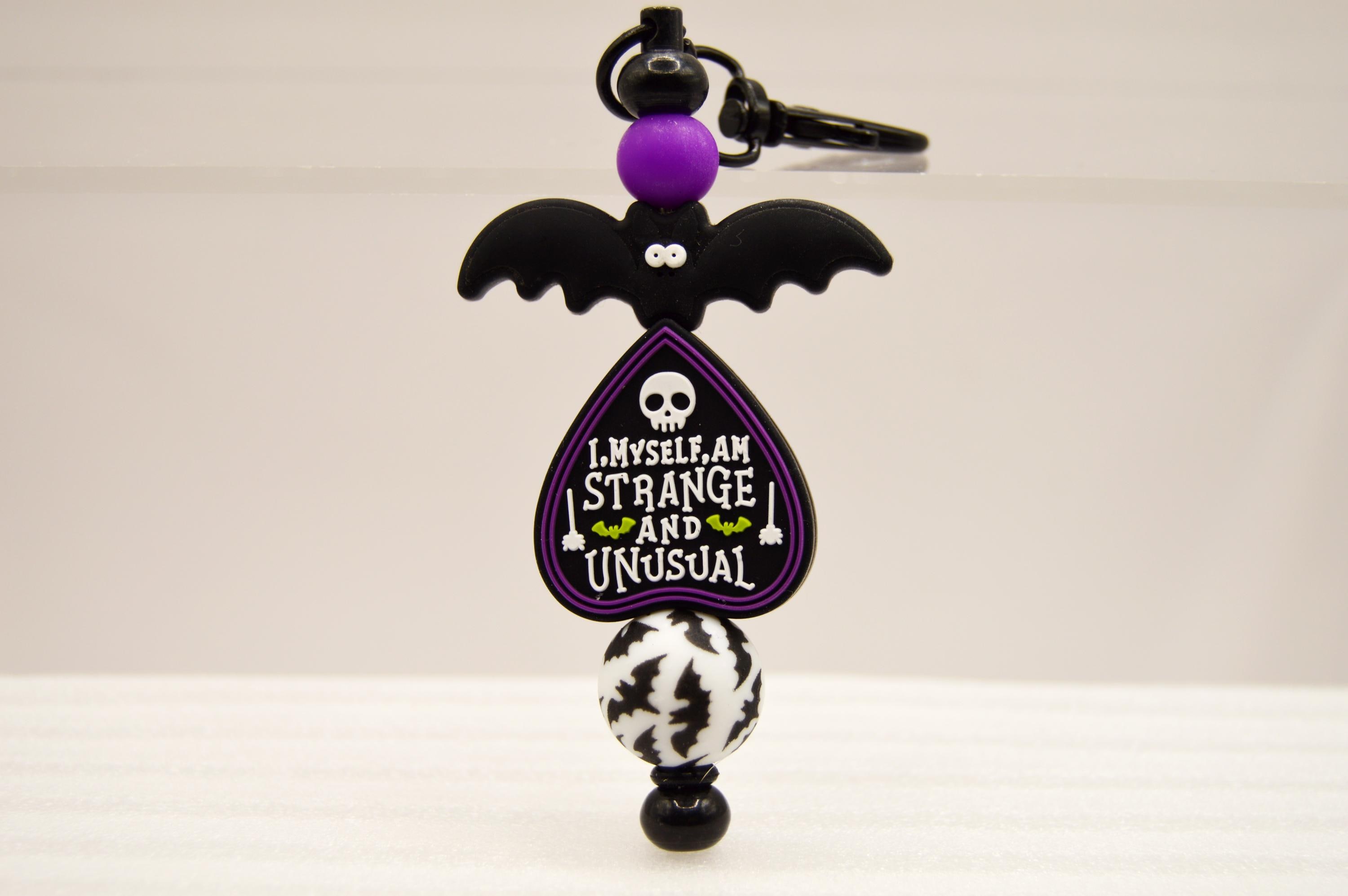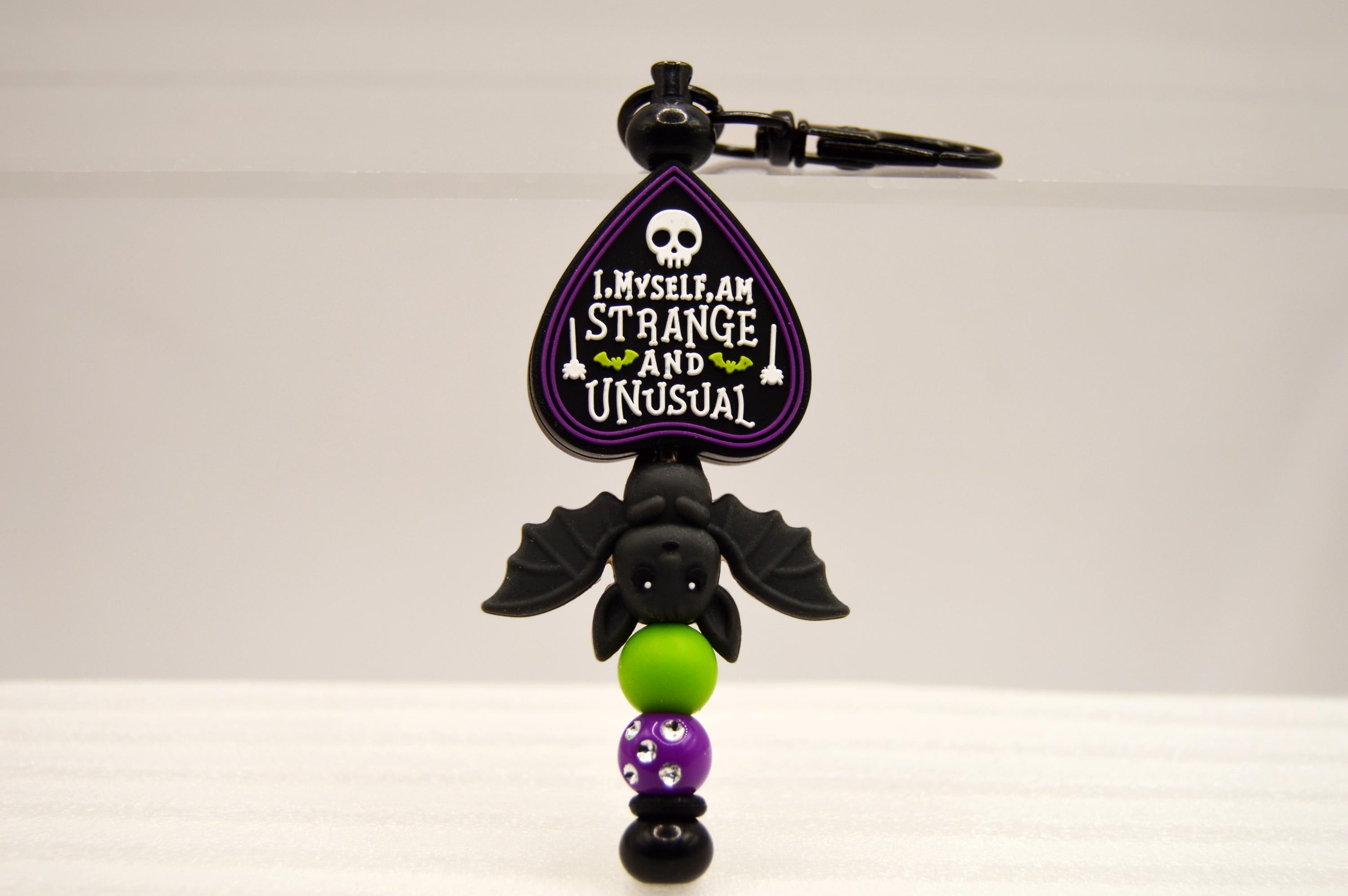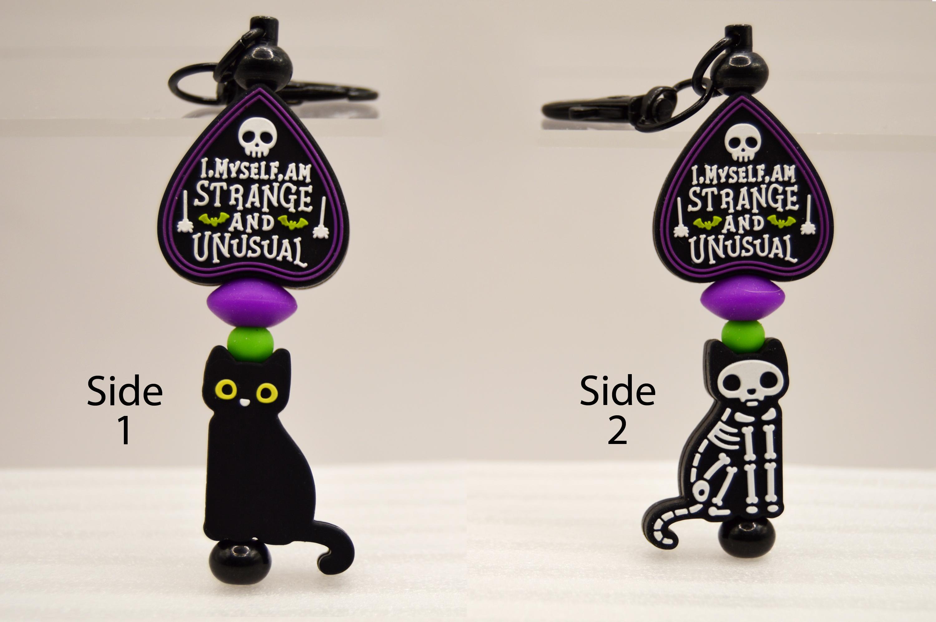 I Myself am Strange and Unusual Key Chain Featuring a Black cat or eyeball or bats. Great purse or bag decoration.