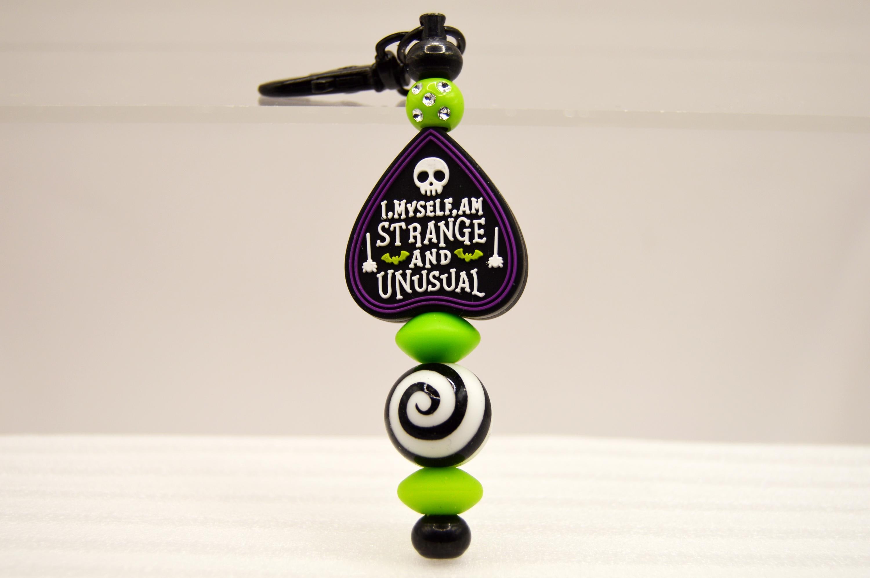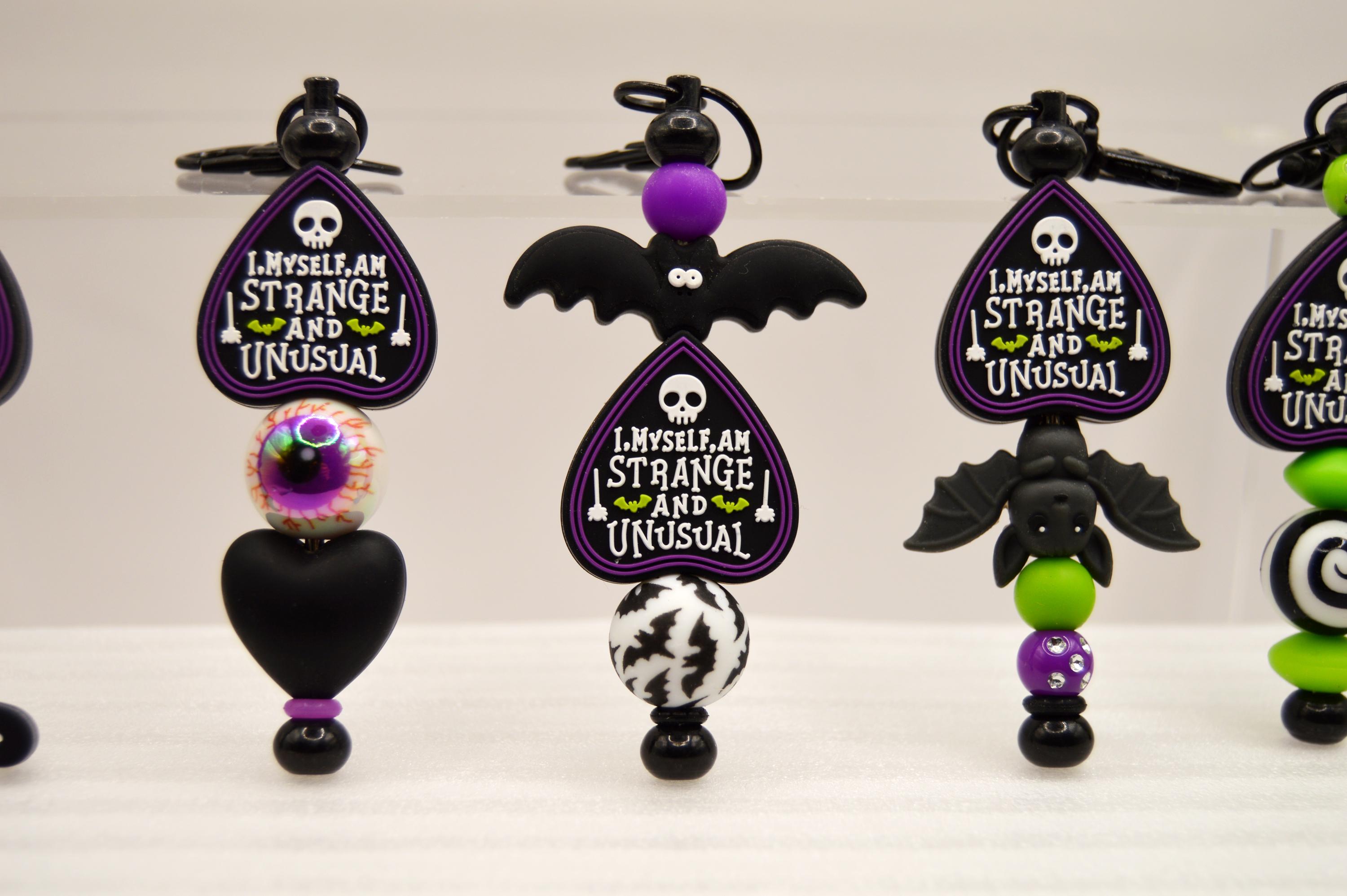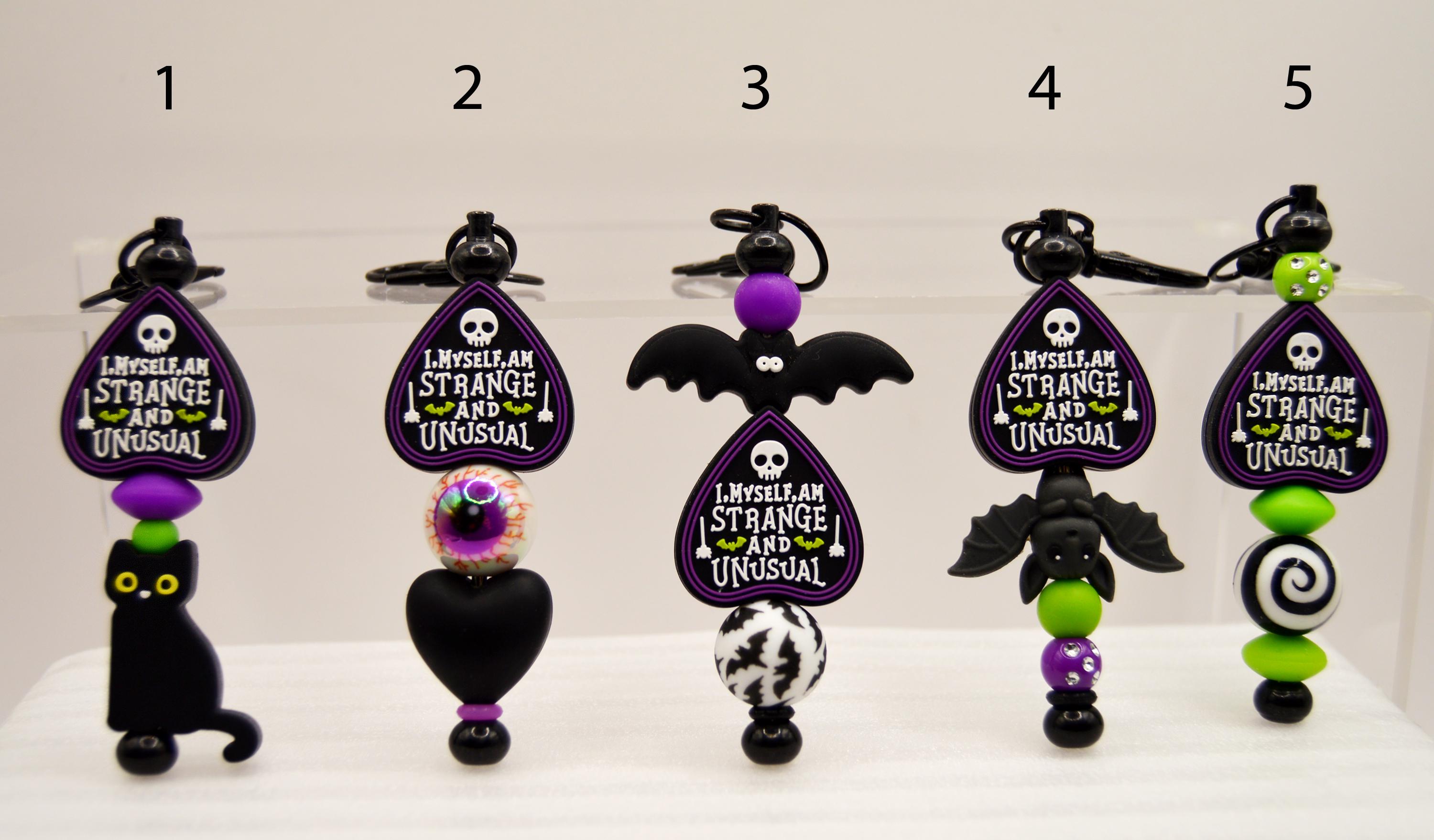 I Myself am Strange and Unusual Key Chain Featuring a Black cat or eyeball or bats. Great purse or bag decoration.