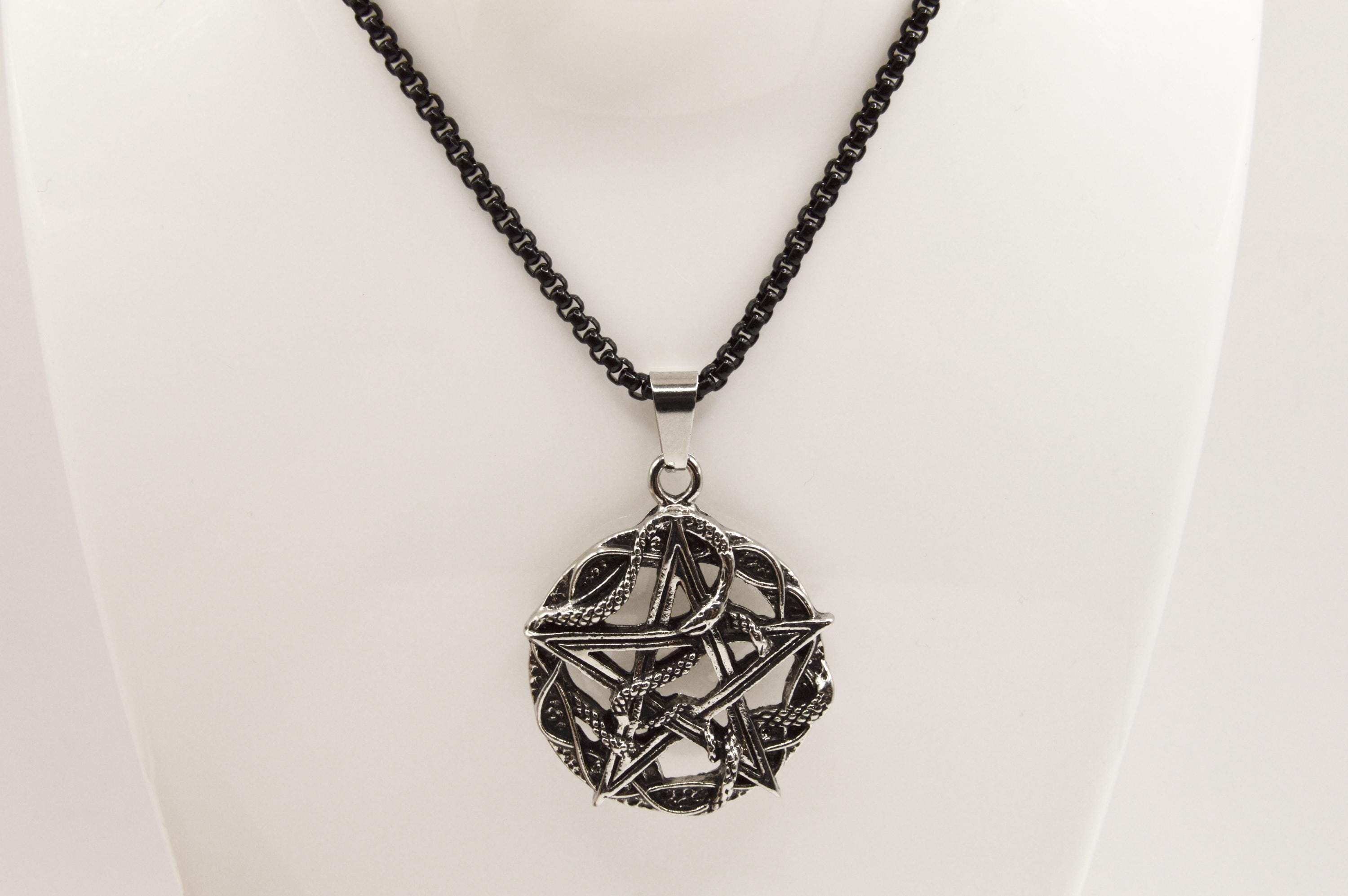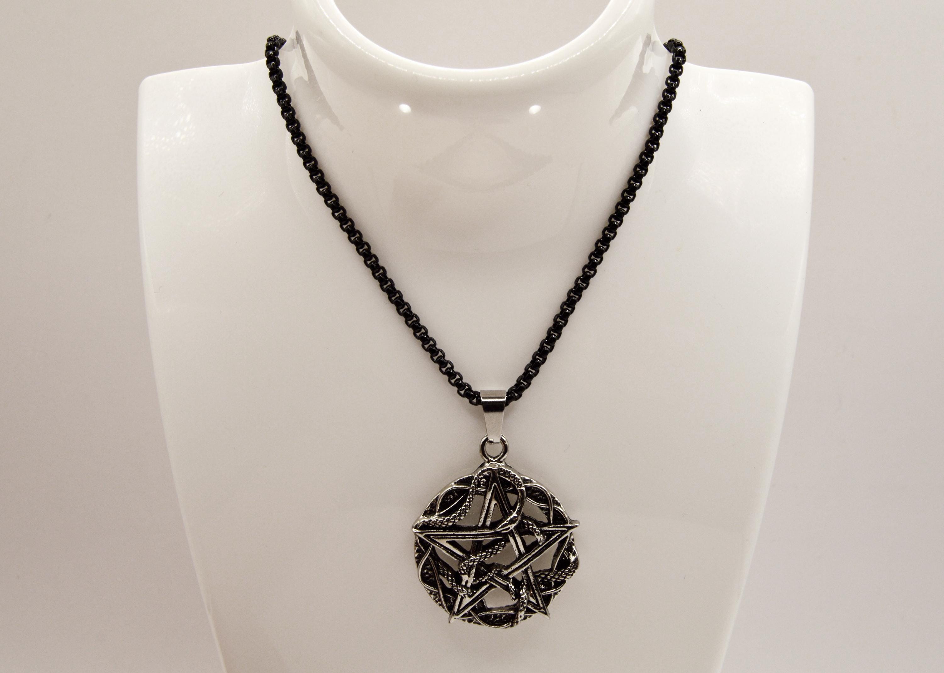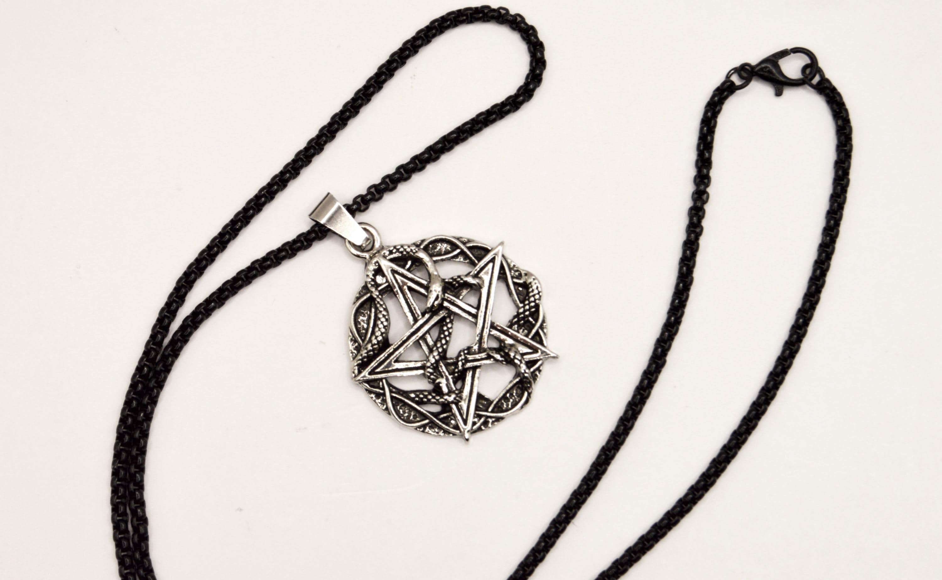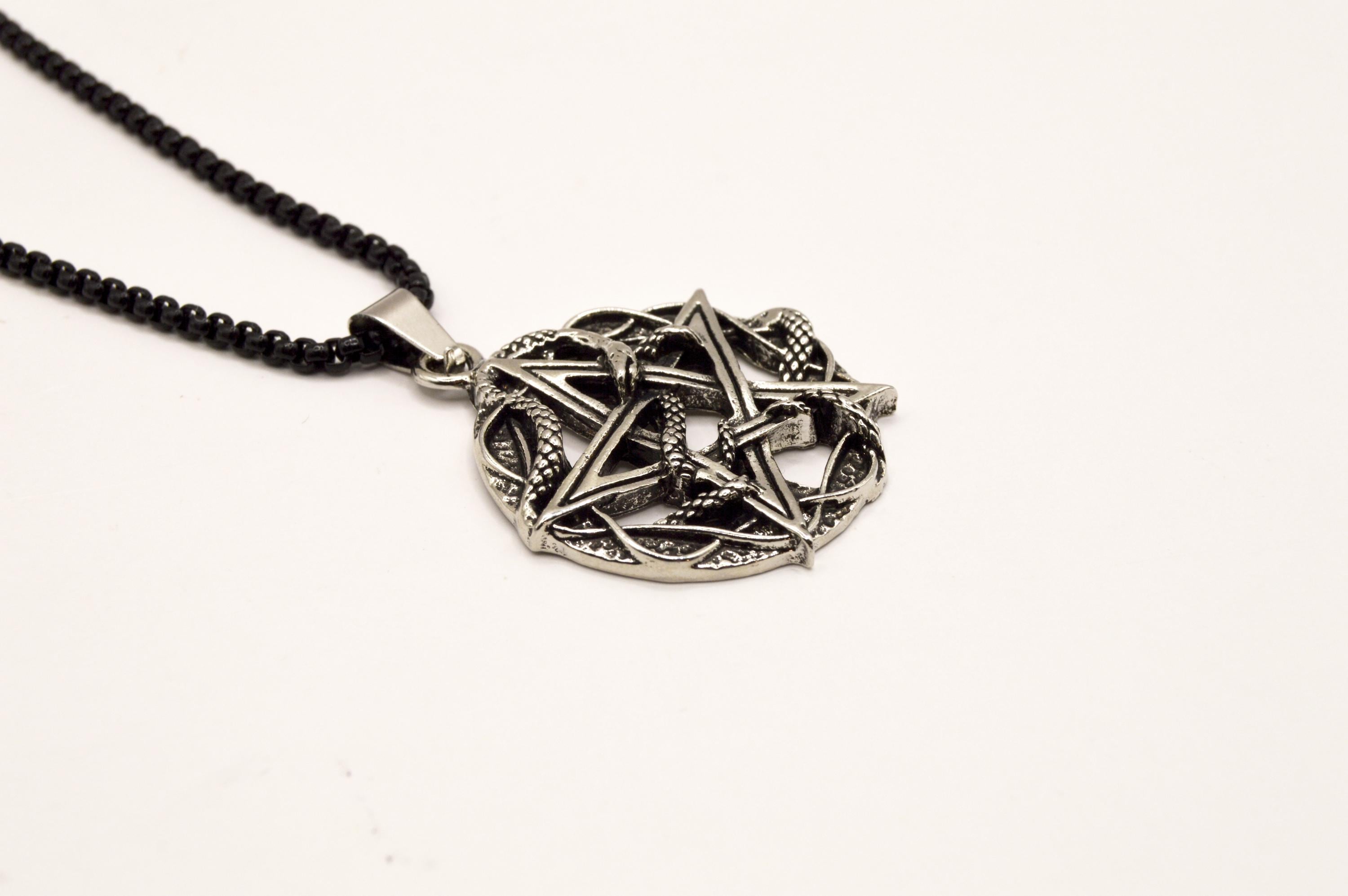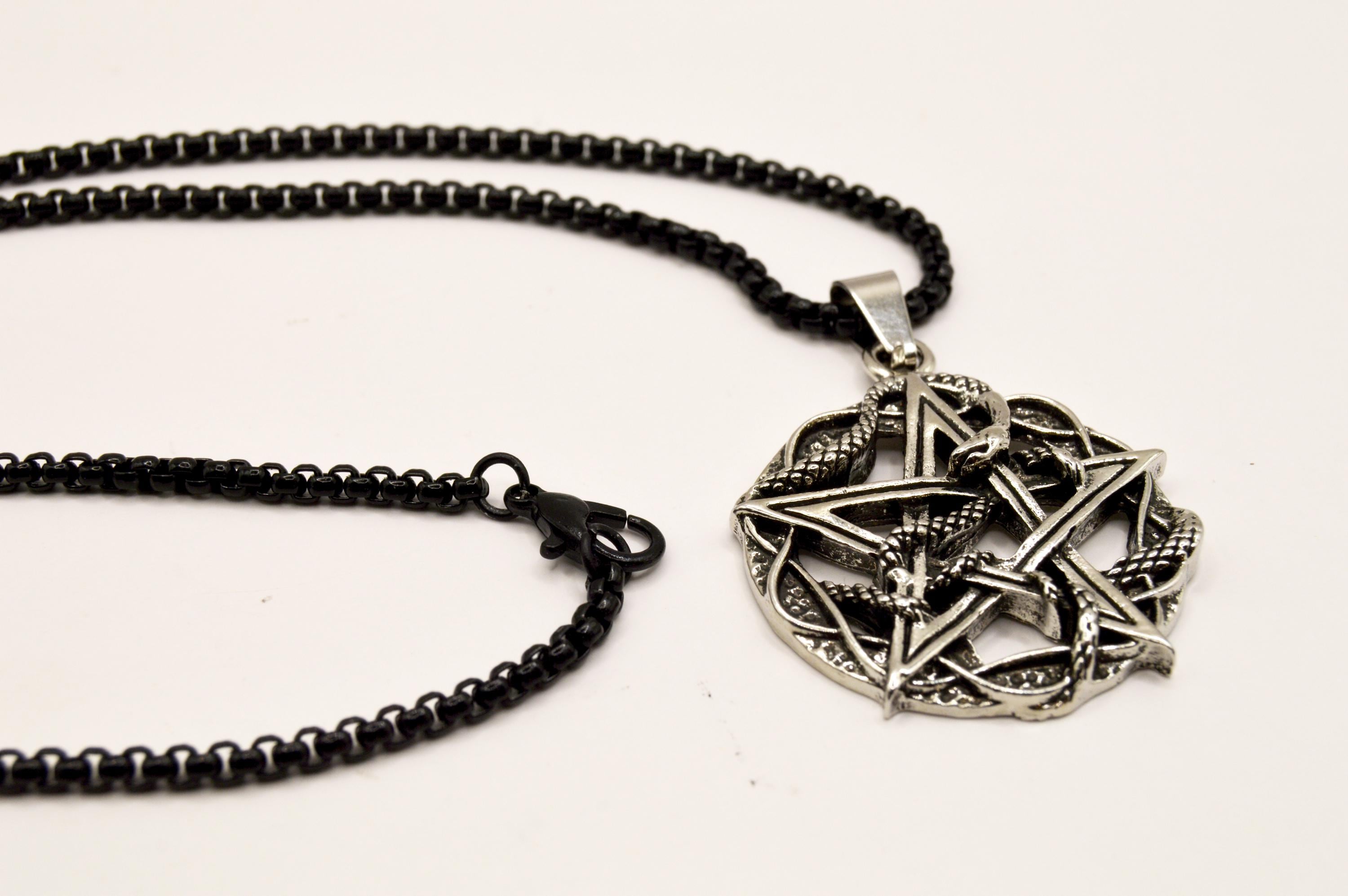 An Intricate Antique Silver Color Pentacle with Snakes, hanging on a black enamel coated stainless steel box chain.