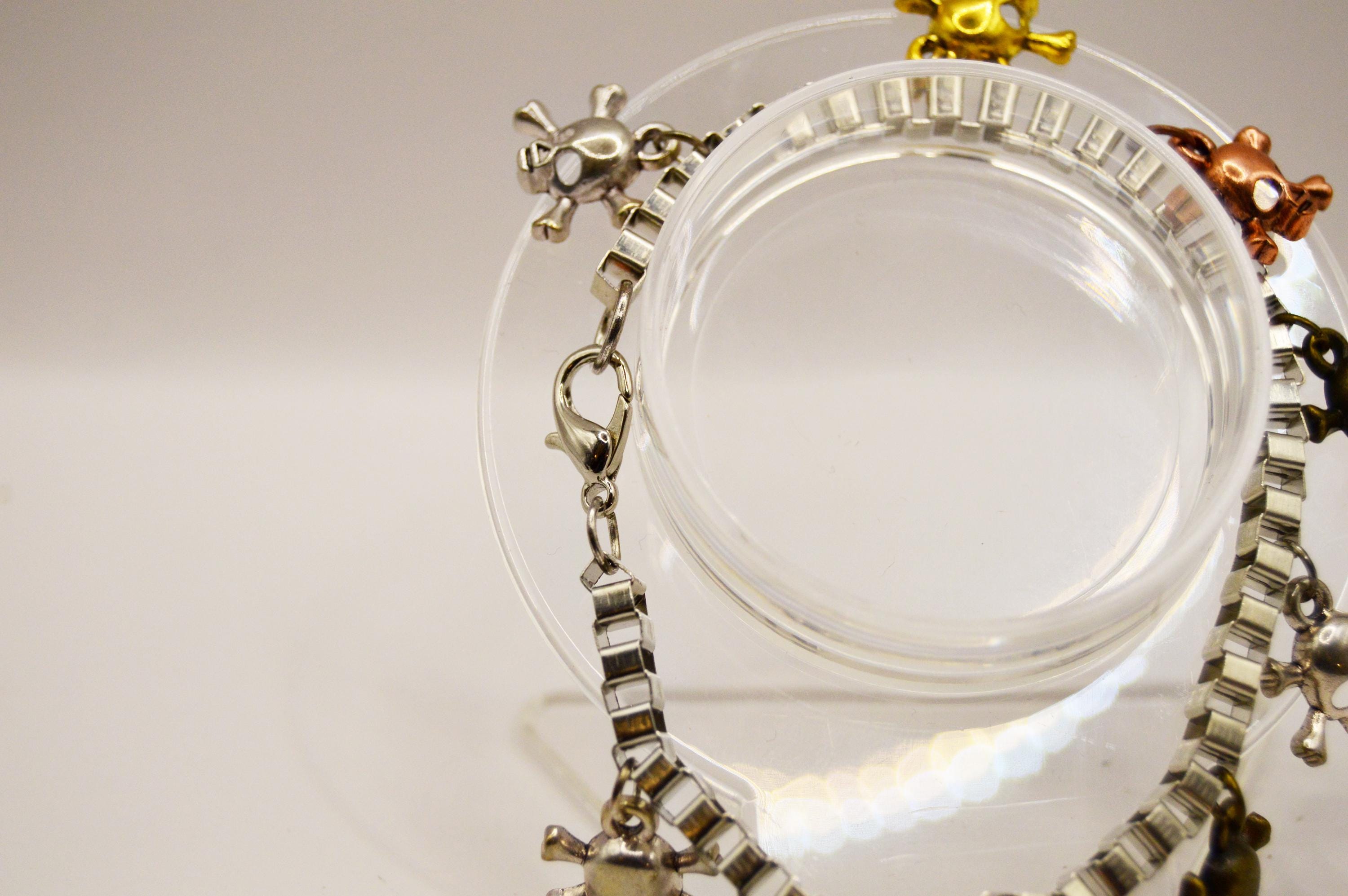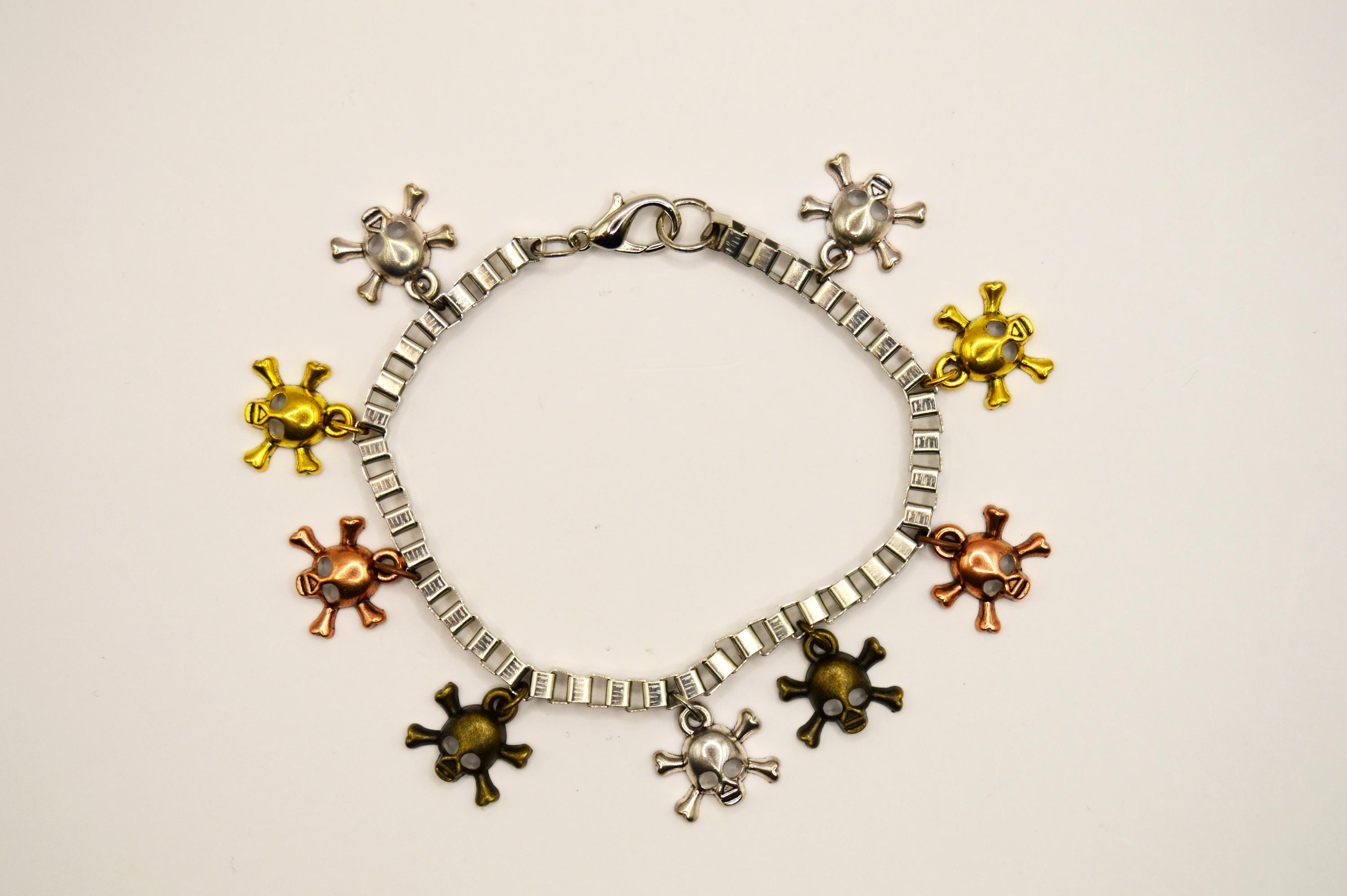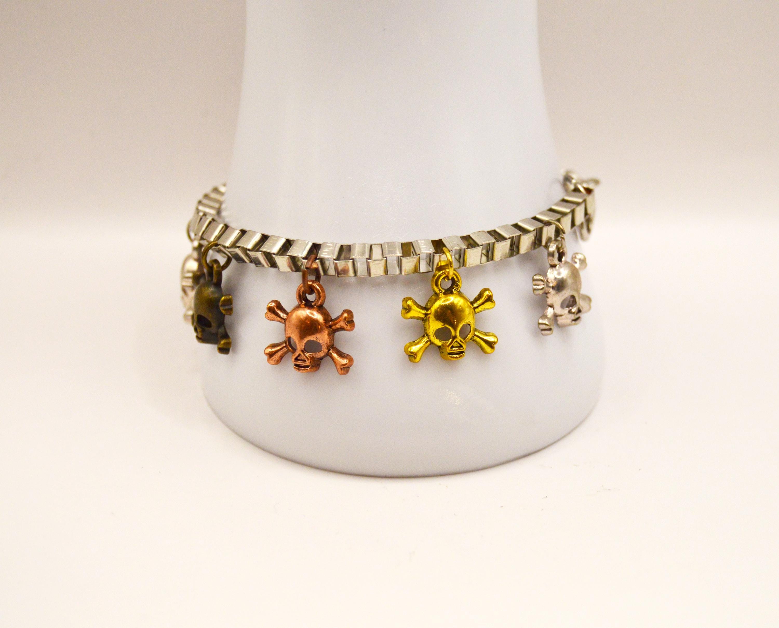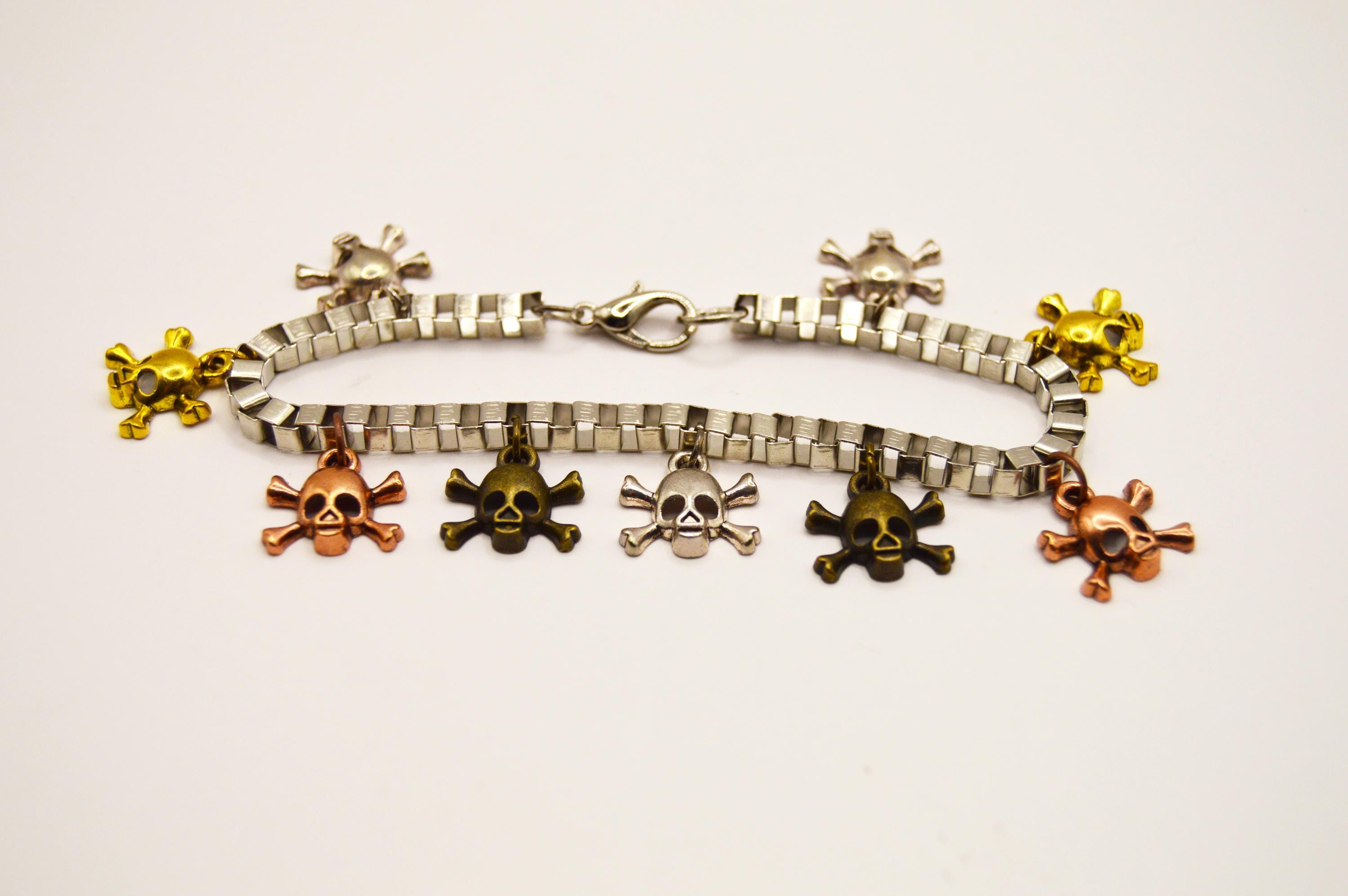 Silver, Brass, Rose Gold, and Gunmetal gray skulls alternate in this unique charm bracelet. It's on a heavy nickel free box chain for durability.